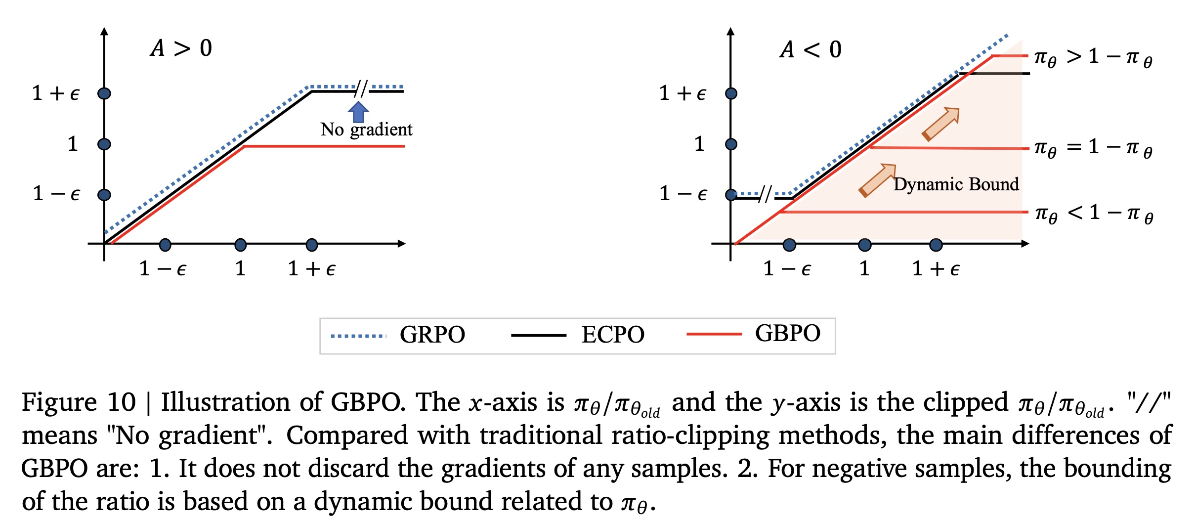 GBPO:。当 很小时, 接近 1,因此的分母被限制,防止比率过大导致梯度爆炸。 对于负样本,