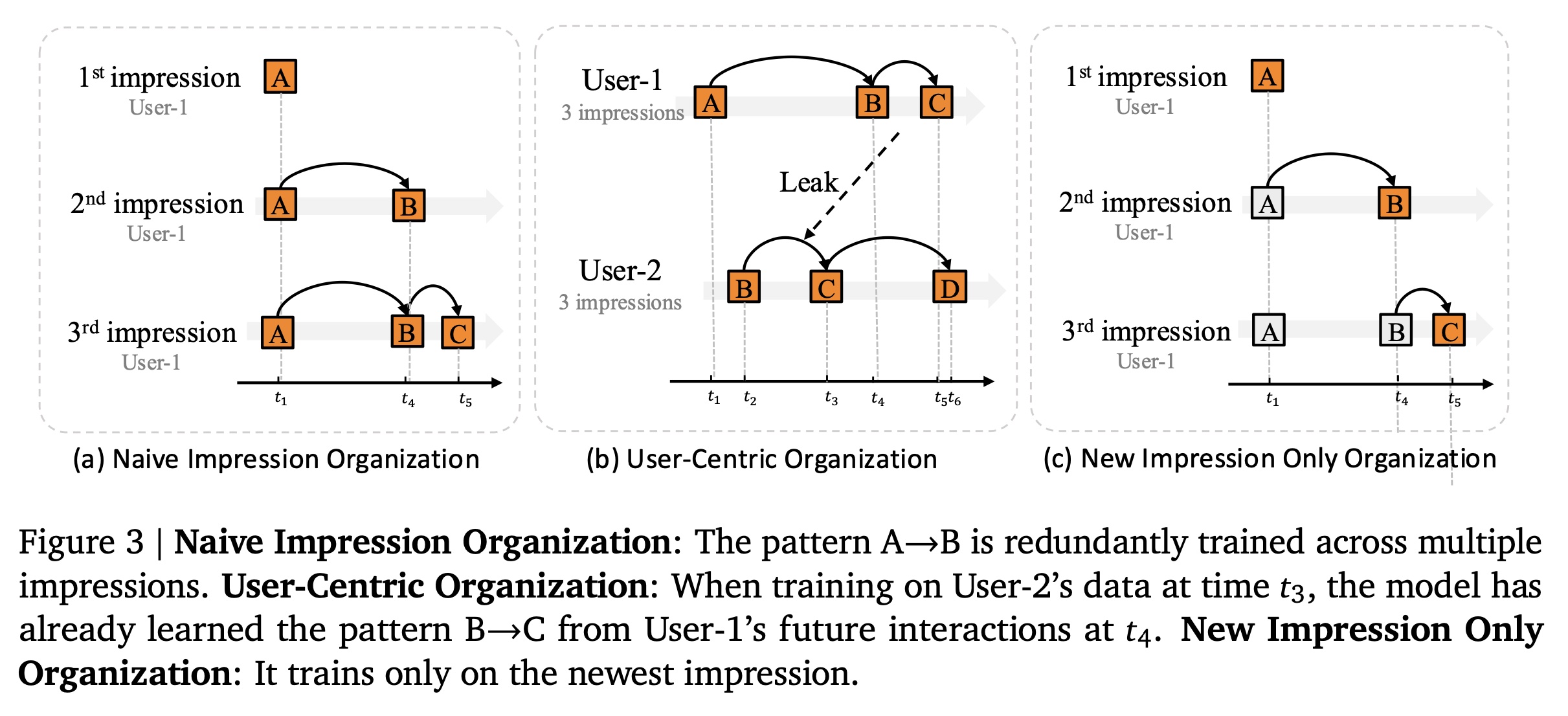 User-1首先被训练,模型已经见过了B -> C的模式。当训练User-2时,第一个step的模式B -> C已经被见过。而User-1的这种模式是发生在t3之后的、属于未来的pattern。在