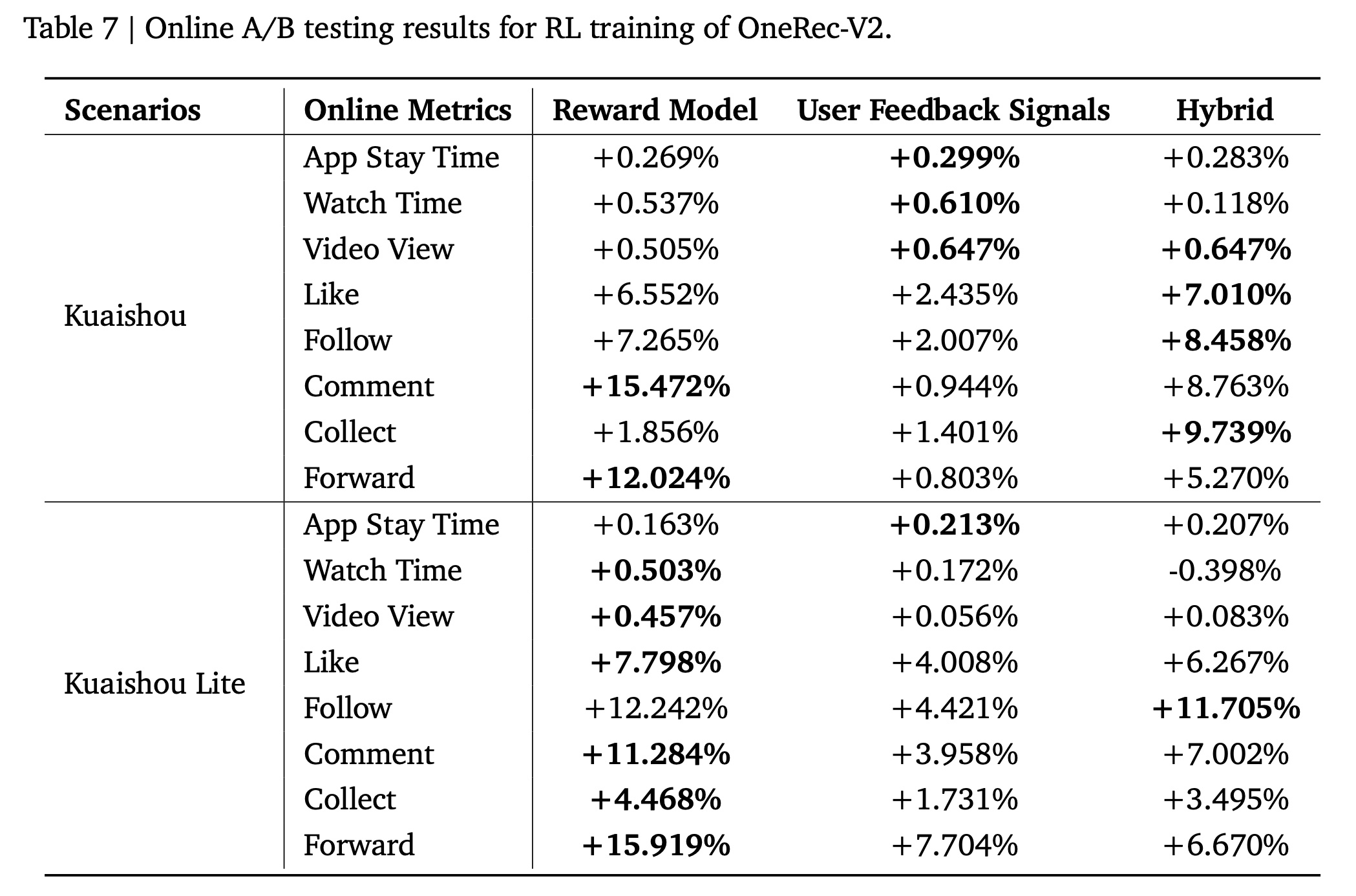 Experiment Settings:我们设置了三组实验进行比较,分别称为 Reward Model、User Feedback Signals、以及 Hybrid。模型设置与 Reinforcement Learning with User Feedback Signals 实验部分相同。评估指标与之前的实验一致,包括基于时长的指标(duration-based metrics )、以及基于交互的指标(interaction-based metrics)。App Stay Time 是最重要的指标,而其他指标作为 user experience 的 reference values。Table 7 中的结果表示每组相对于 OneRec-V1 的相对性能。