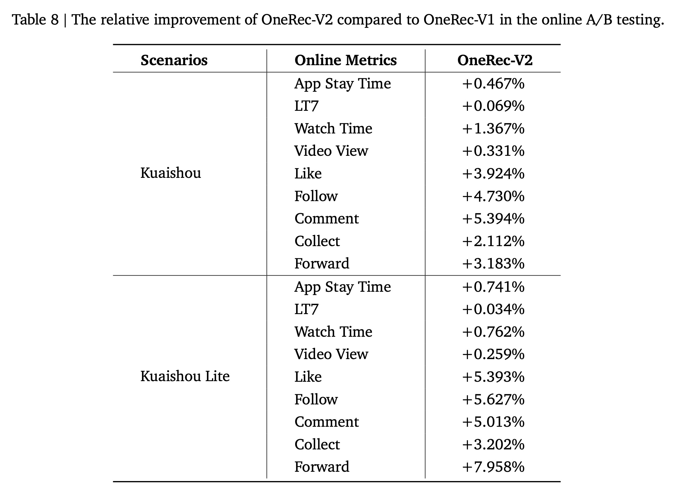 如 Table 8 所示,OneRec-V2 在两个平台上都取得了显著提升。此外,OneRec-V2 在所有 user interaction metrics 上都表现出显著增长,包括点赞( likes)、关注(follows)、评论(comments) 和其他互动行为(engagement behaviors ),表明其能够引导 multi-task recommendation systems 走向更平衡的状态,同时有效缓解 competing objectives 之间的跷跷板效应。