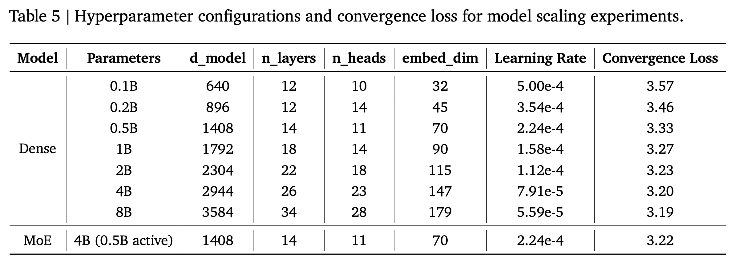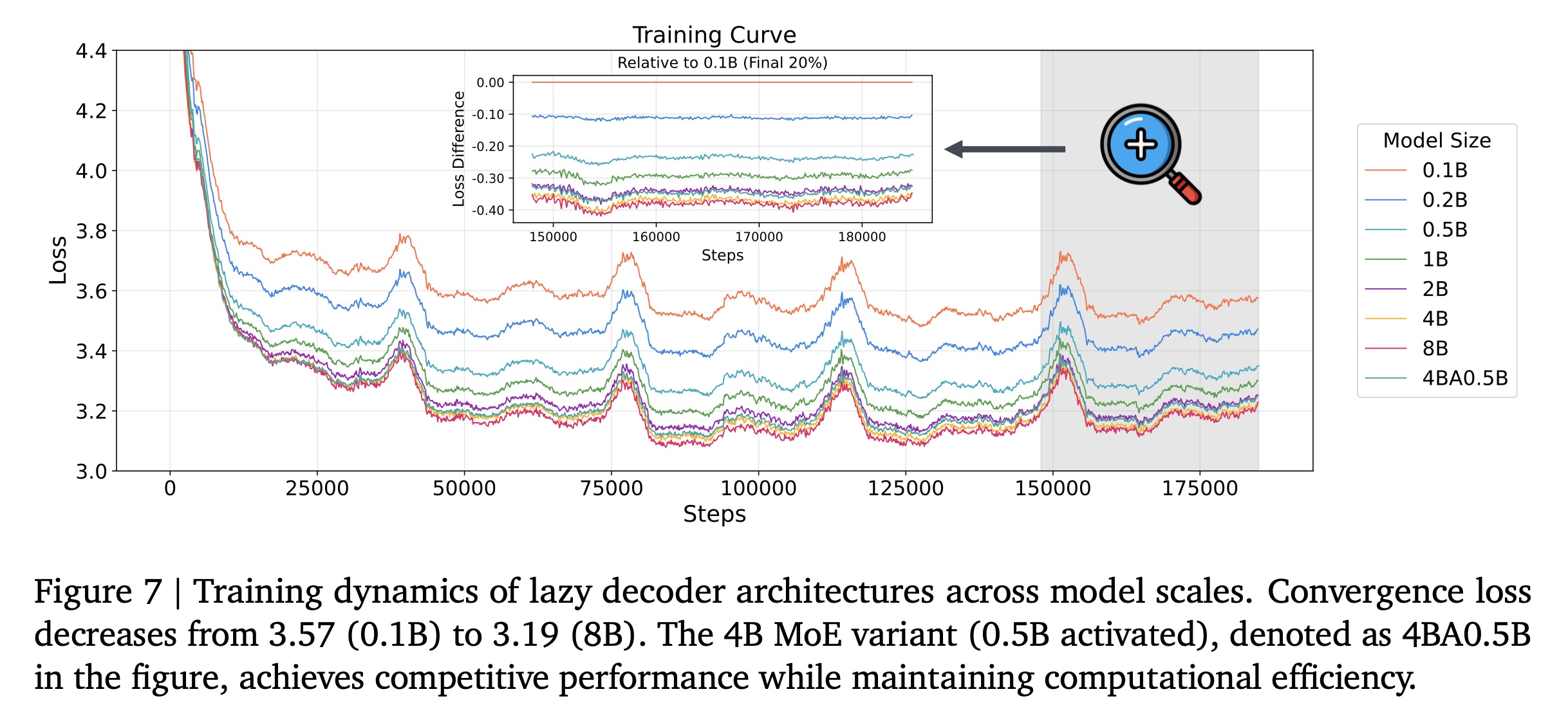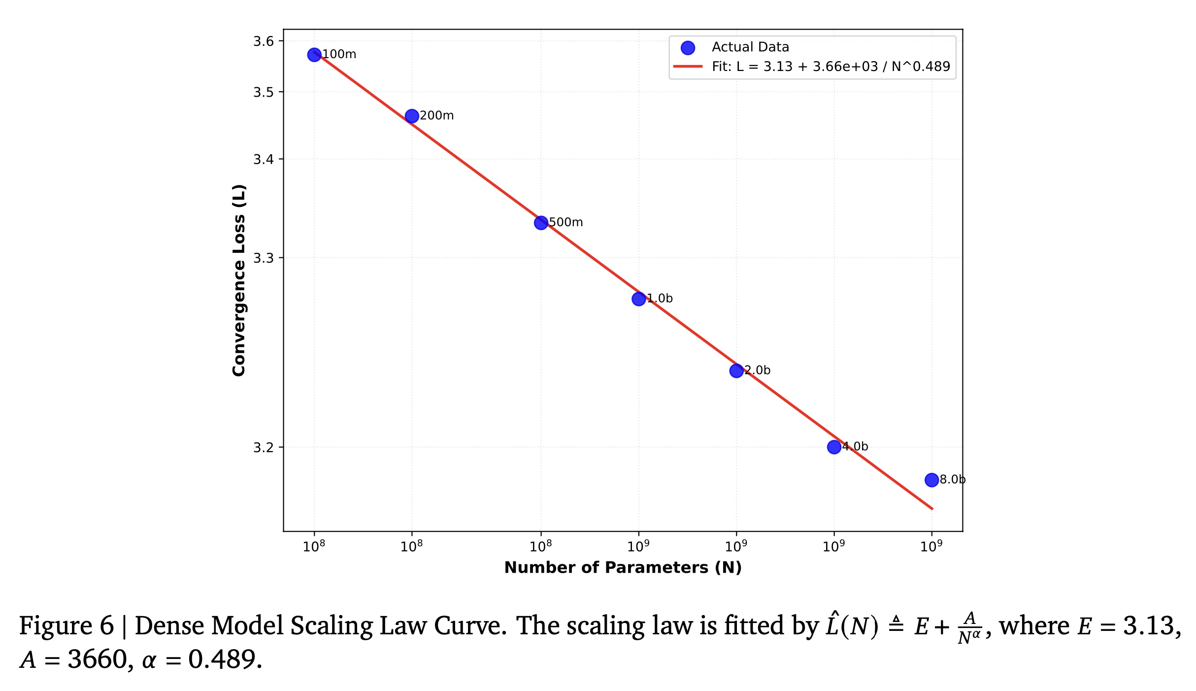 Scaling:当模型参数从 0.1B 扩展到 8B 时,我们观察到 loss 持续下降,这与 《Training compute-optimal large language models》 提出的 empirical scaling law 高度吻合。我们的结果与该 scaling relation 表现出极好的一致性,如Figure 6 所示。这验证了所选架构的有效性,并表明进一步的 scaling 和架构创新有可能带来更优的性能。