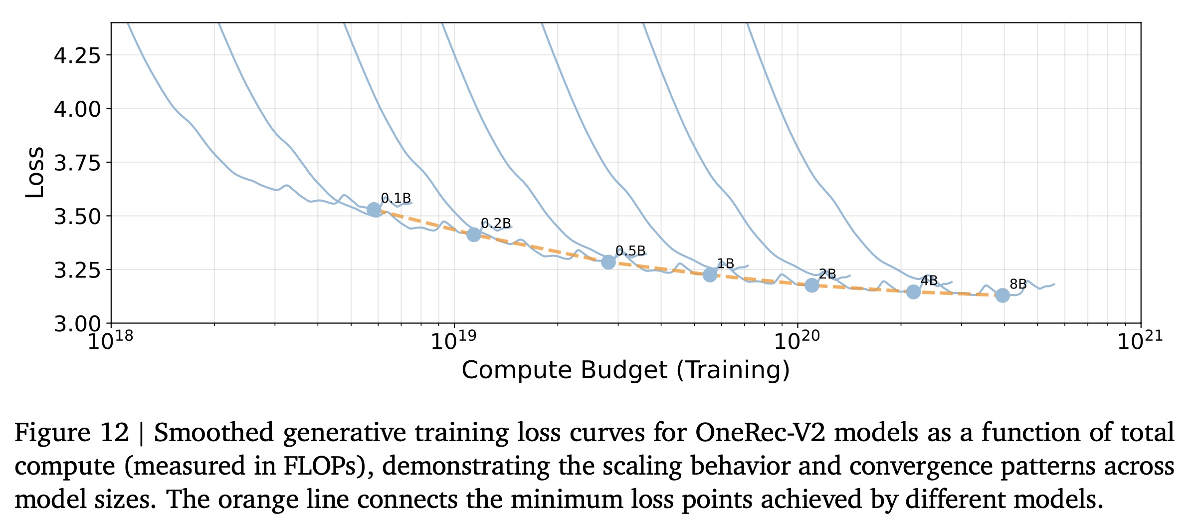 我们进行了实验,以研究 OneRec-V2 模型的 model size 、compute budget 和 training loss 之间的关系。Figure 12 展示了不同规模模型的 smoothed generative training loss curves ,作为 total compute (以 FLOPs 衡量)的函数。具体而言,更大的模型需要更多的计算资源才能达到相同的 loss value,但它们也会收敛到更低的 loss points,这与大型语言模型领域的观察结果一致。