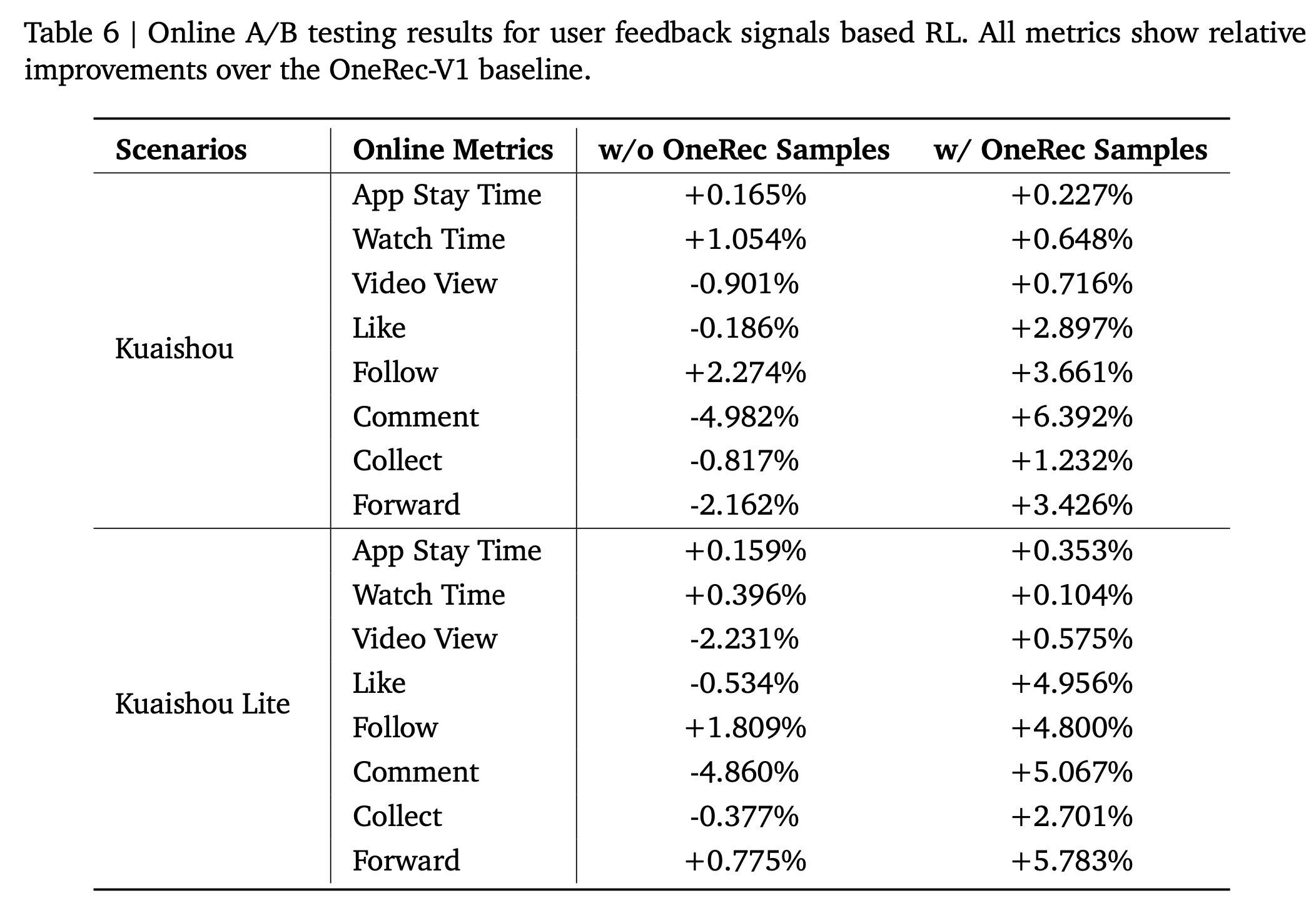 当仅使用传统 pipeline 的样本(即与 OneRec-V1 具有相同的样本来源)时,引入 user-feedback-based reinforcement learning 显著改善了与时长相关的指标(如 App Stay Time and Watch Time ),但牺牲了一些其他指标(如 Video View )。这表明我们的 duration-aware reward 确实与 App Stay Time 密切相关。