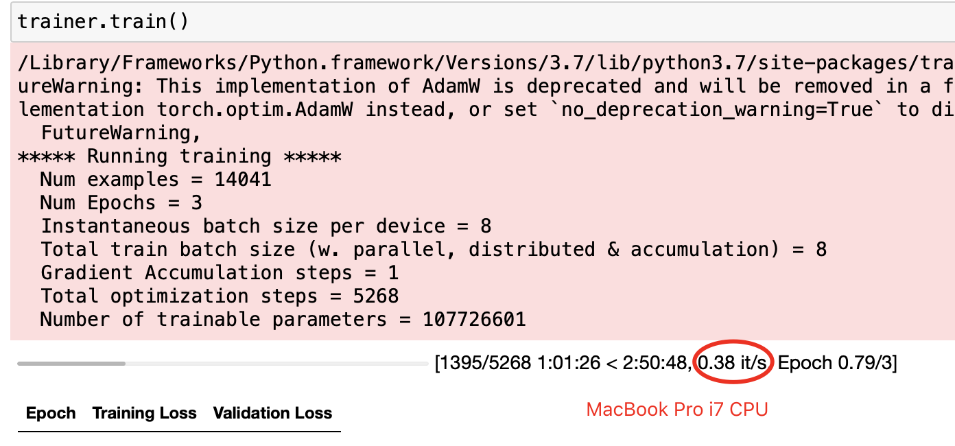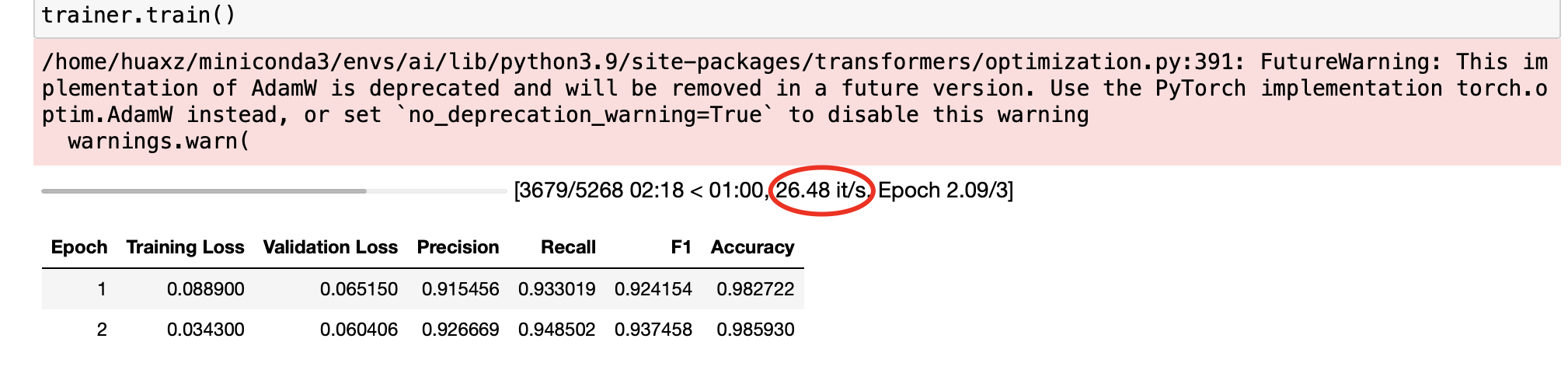 trainer = Trainer( model=model, args=args, train_dataset=tokenized_datasets["train"], eval_dataset=tokenized_datasets["validation"], data_collator=data_collator, compute_metrics=compute_metrics, tokenizer=tokenizer,)trainer.train()# TrainOutput(global_step=5268, training_loss=0.06639557918455896, # metrics={'train_runtime': 198.3512, 'train_samples_per_second': 212.366, 'train_steps_per_second': 26.559, 'total_flos': 923954298531210.0, 'train_loss': 0.06639557918455896, 'epoch': 3.0})建议使用 GPU 训练,CPU 速度太慢。在 MacBook Pro 2018 (型号 A1990)上训练速度:0.38 iteration/s,在 RTX 4090 上训练速度 26.48 iteration/s 。