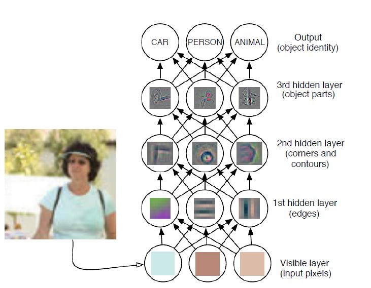 如下所示的图片识别任务中,如果直接学习从一组像素到物体的映射很困难。深度学习通过将所需的复杂映射分解成一系列嵌套的简单映射来解决该问题。每个映射由模型的不同层来描述: