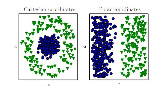 下图的线性分类任务中:左图采用笛卡尔坐标系,右图采用极坐标系。