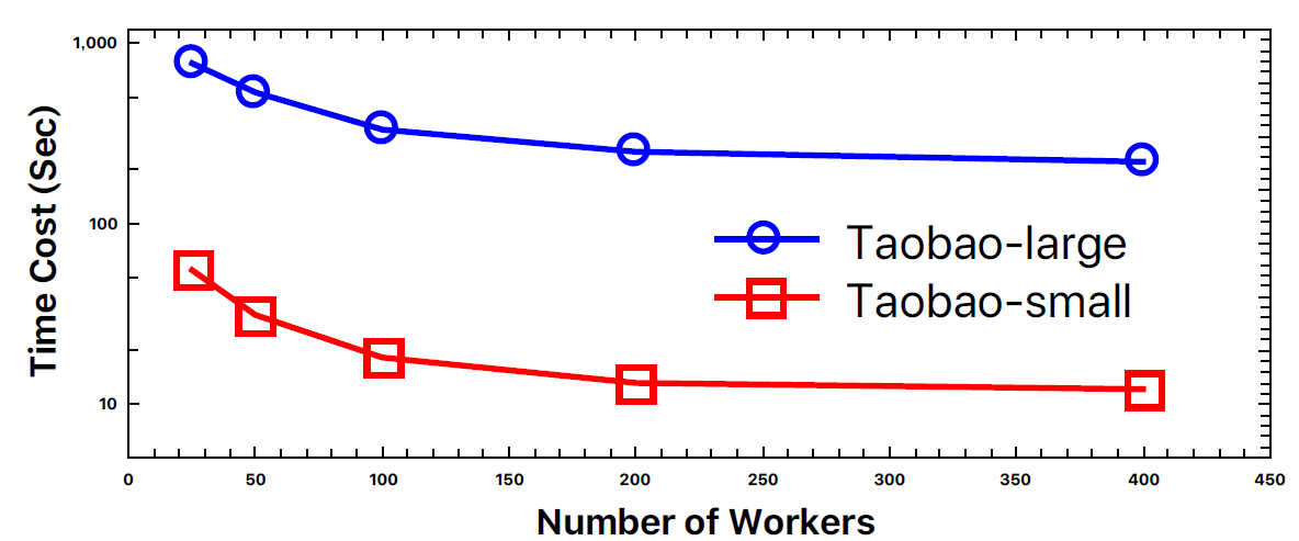worker 数量的增加,图构建的时间明显降低。AliGraph 可以在几分钟内构建大图,如Taobao-large 五分钟构建完成。这比大多数SOTA 的实现要快很多(例如 PowerGraph 需要几个小时)。