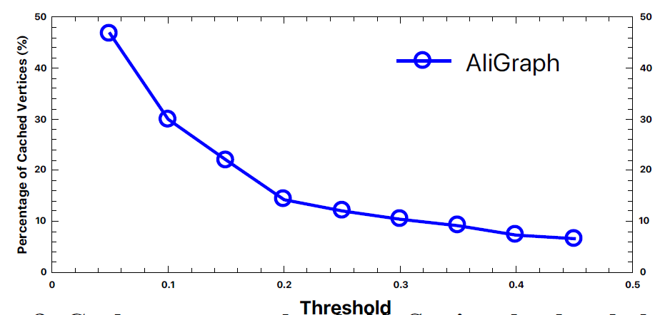 下图给出了被缓存的节点数量的百分比和阈值之间的关系。我们注意到:随着阈值的增加,被缓存的节点数量百分比在下降。当阈值小于 0.2 时,百分比下降速度较快;当阈值大于等于0.2 时,百分比相对稳定。这是因为如定理中所证明的那样,节点的 importance 服从幂律分布。