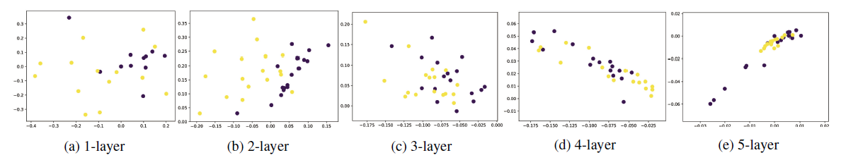 但是,这也会带来过度平滑 over-smoothing 的潜在风险。如果 GCN 有很多层的卷积层,则最终输出的特征可能过于平滑,使得来自不同 cluster 之间的节点变得难以区分。如下图所示为 karate club 数据集分别使用 1、2、3、4、5 层 GCN 训练的节点 embedding 可视化的结果,不同颜色表示不同的类别。可以看到,随着卷积层数量的增加,过度平滑很快发生。除此之外,使用很多层的卷积层也使得训练变得更加困难。