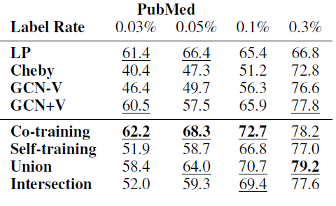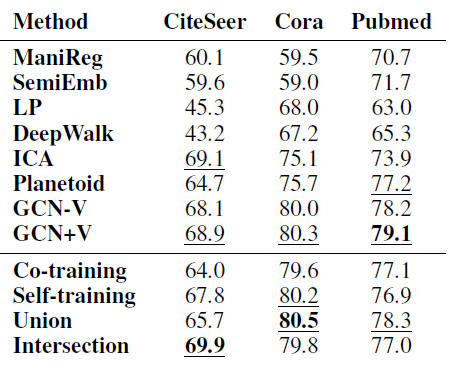 Co-Training 、Self-Training 分别挖掘出各自最置信的未标记节点。GCN,这称为 Union。其中使用预先训练好的 GCN 来作为二次训练的初始化。GCN,这称为 Intersection。其中使用预先训练好的 GCN 来作为二次训练的初始化。注意:我们在扩展的标记数据上训练 GCN,无需任何额外其它验证数据。只要扩展的标记数据包含足够多的正确的标记数据,则我们的方法就有希望训练出良好的 GCN 分类器。