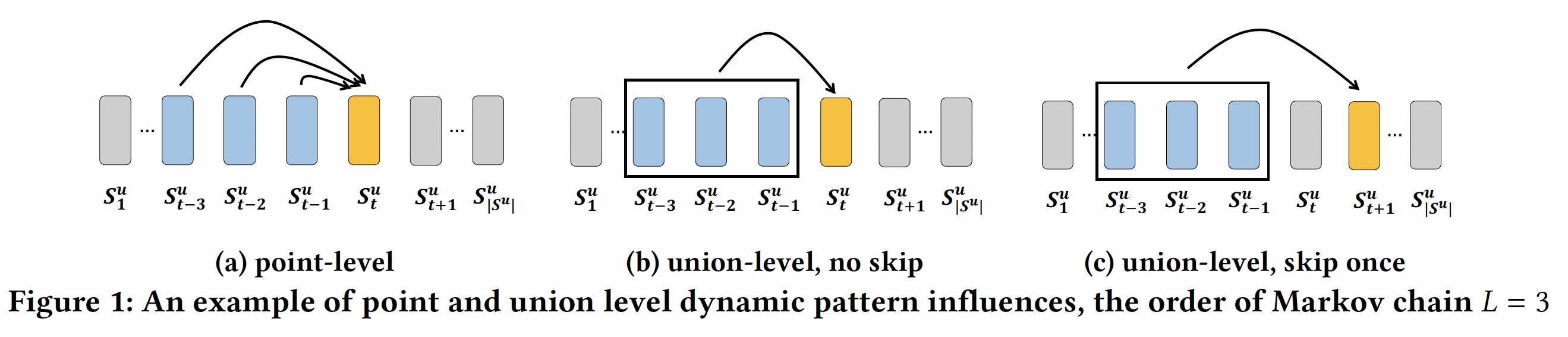 FOSSIL:该方法将 factored item similarity 和马尔科夫链相结合,从而建模用户的长期偏好和短期偏好。注意,我们将 session 的长度是可变的。