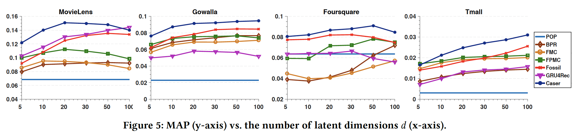 具体而言,HRM 在 Tmall 和 Gowalla 数据集上的 Recall@50 的相对性能(相对于 FPMC 方法)提升分别为 6.7% 和 4.5% 。这证明了多个因子 factor之间的交互可以通过最大池化操作来学习。