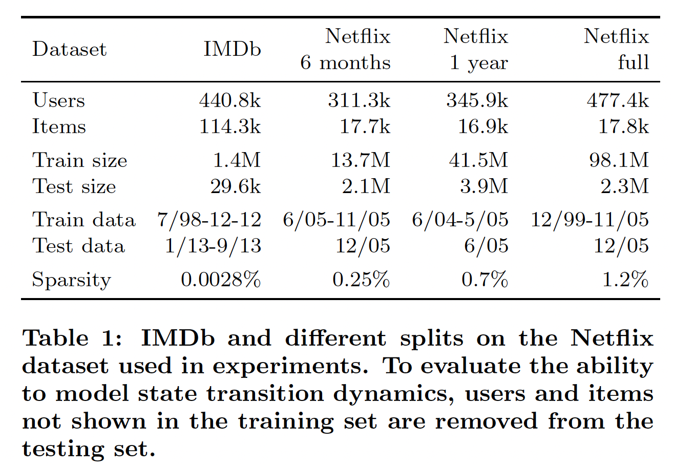 IMDB 数据集:包含 1998 年 7 月到 2013 年 9 月期间收集的 140 万个评分。Netflix 数据集:包含 1999 年 11 月到 2005 年 12 月期间收集的 1 亿个评分。每个数据点是一个 (user id, item id, time stamp, rating) 元组,时间戳的粒度为 1 day 。为了更好地理解我们模型的不同方面,我们在具有不同训练和测试周期的几个不同时间窗口上测试我们的模型。详细的数据统计如下表所示。