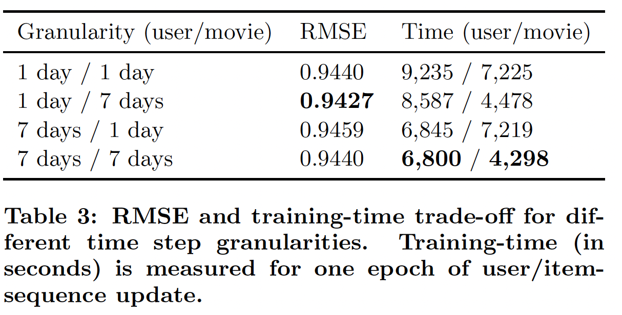 PMF:尽管简单,然而 PMF 在评分预测方面取得了鲁棒的、强大的结果。由于我们的模型采用与 PMF 相同的因子分解来建模静态效应,因此和 PMF 比较的结果直接展示了我们的方法建模 temporal dynamic 的好处。我们使用 LIBPMF ,并使用网格搜索 grid search 来搜索正则化系数 factor size TimeSVD++:TimeSVD++ 是捕获temporal dynamic 的最成功的模型之一,并在 Netflix 竞赛中展示了强大的结果。我们使用网格搜索 grid search 来搜索正则化系数 factor size AutoRec:AutoRec 学习一个自编码器从而将每个电影(或每个用户)编码到低维空间,然后解码从而进行预测。就评分预测而言,它是迄今为止最好的神经网络模型之一,并在多个数据集上取得了 state-of-the-art 结果。我们使用原始论文中的超参数((latent state 维度 我们的评估指标是标准的 root-mean-square error: RMSE。不同数据集的结果如下表所示。这里,我们对 Netflix full 和 IMDB 使用 2 个月粒度的 time step ,对 6-month Netflix 数据集使用 1day/7 days (对应于 user/movie)粒度的 time step 。我们将在后续讨论 time step 粒度的选择。我们将模型运行 10 个 epoch,在每个 epoch 结束之后计算验证集的 RMSE。我们报告在验证集上效果最好的模型在测试集上的测试 RMSE 。