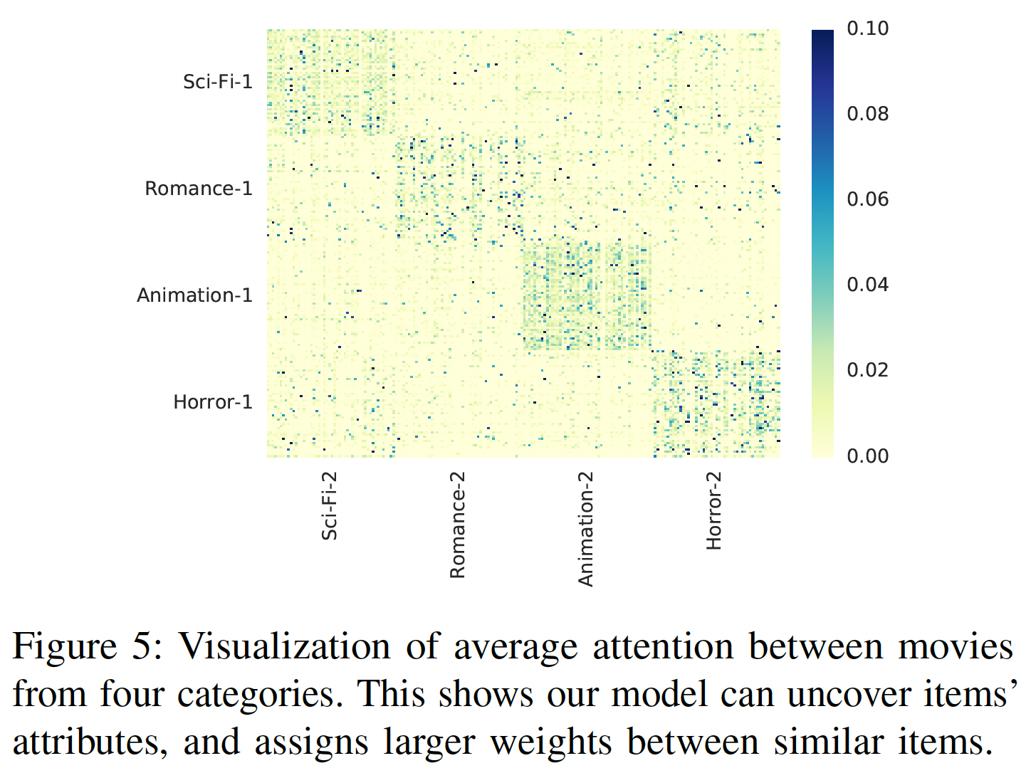 最后,值得指出的是,相同 item 在不同用户上的影响也是不同的,因为 attention layer 中权重的学习过程是由 user embedding 指导的,而 user embedding 是个性化的。