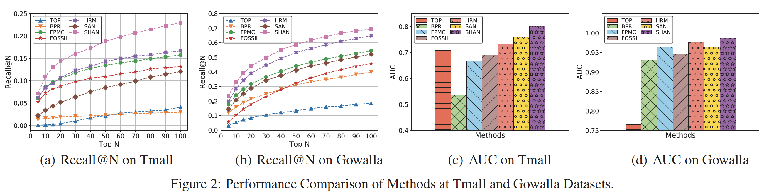 在大多数情况下,所有混合模型(即,FPMC, FOSSIL, HRM, SHAN)在两个数据集的不同指标下均优于 BPR 。以 AUC 为例,混合模型相对于 BPR 的性能提升持续保持在非常高的水平。这表明序列信息对于我们的任务非常重要,而 BPR 忽略了它。另外,SHAN 在这些混合模型中获得了最佳性能。