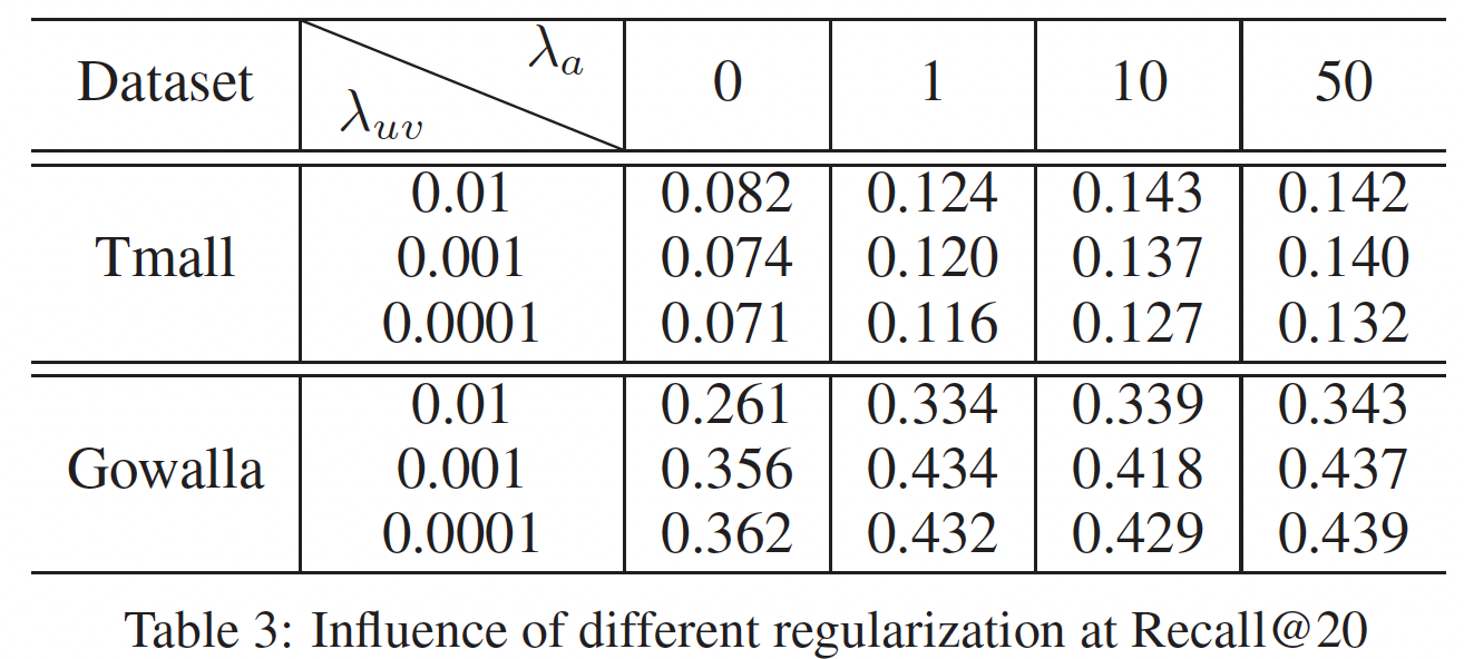 在我们的模型中,我们利用 user embedding 和 item embedding 正则化系数 Recall@20 指标的影响。