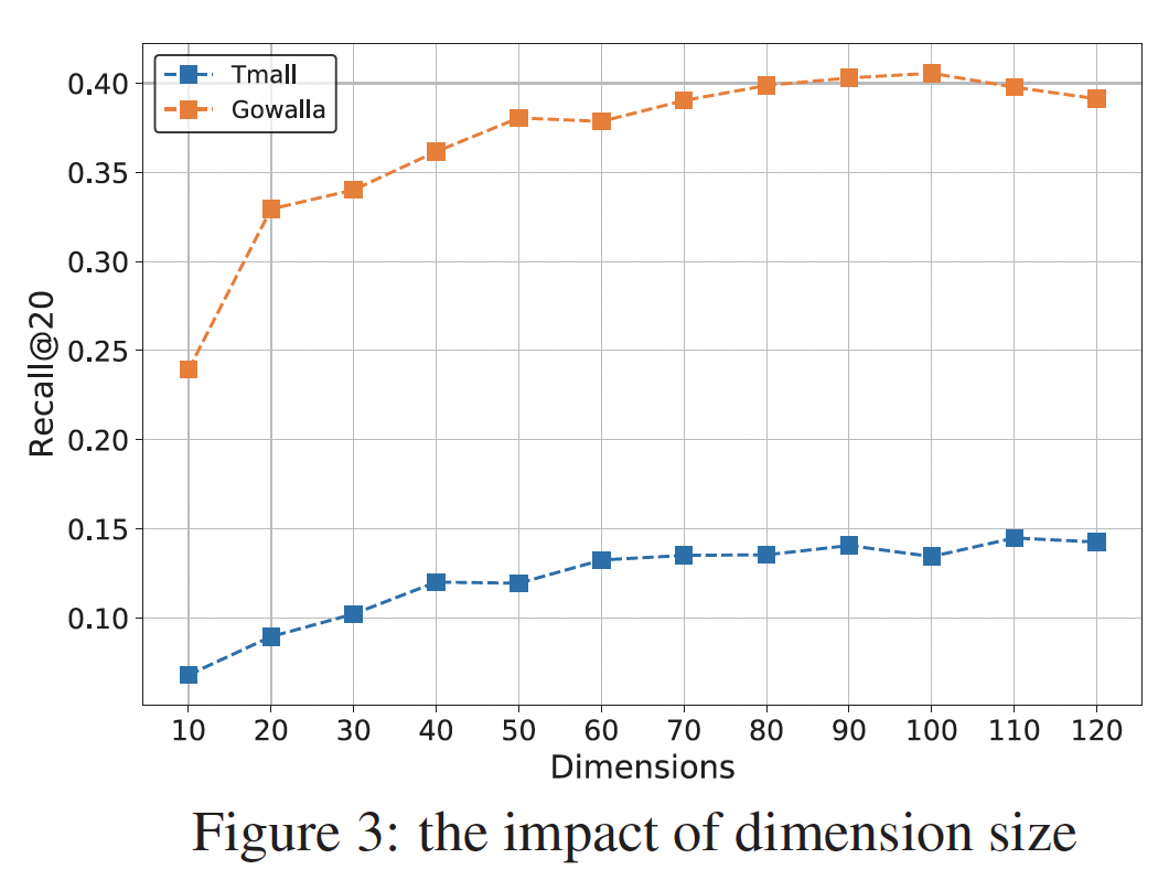 我们进一步研究了维度大小 user embedding 和 item embedding 的 size 有关,还与注意力网络中的 MLP 参数有关。为简单起见,user embedding 和 item embedding 的 size 是相同的。