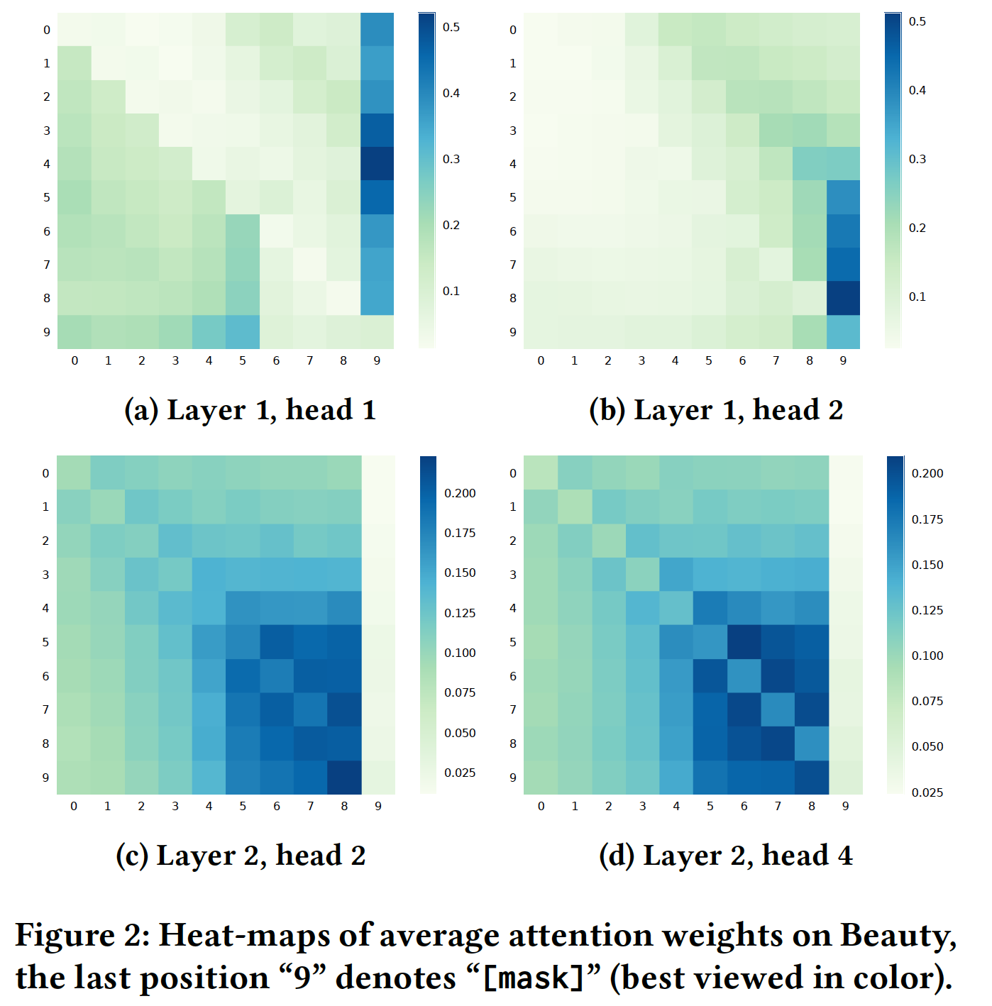 不同 head 的注意力不同。例如,在 layer 1 中,head 1 倾向于关注左侧的 item,而 head 2 更喜欢关注右侧的 item 。