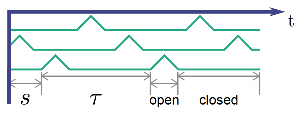 oscillation 的实时周期 real-time period 。open 阶段的持续时间与整个周期的占比。Phased LSTM cell 的 oscillation 的阶段偏移 phase shift 。所有这些参数都可以在训练过程中学习。