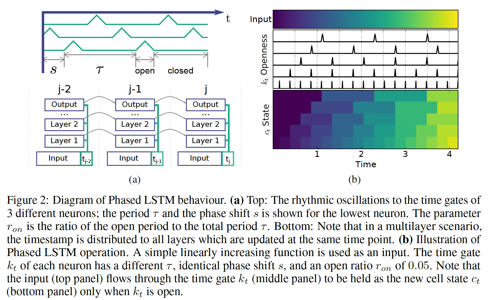 尽管固定的 time step 完全适合许多 RNN 的 application,但是在一些重要的场景中,恒定的采样率会对 RNN 的效率和效果造成限制。许多现实世界中的自动驾驶或机器人任务需要整合来自各种传感器的输入,每个传感器都可能有自己的数据采样率。为此,论文 《Phased LSTM: Accelerating Recurrent Network Training for Long or Event-based Sequences》提出了一个新的 RNN 模型,它可以处理在异步时间采样的输入。