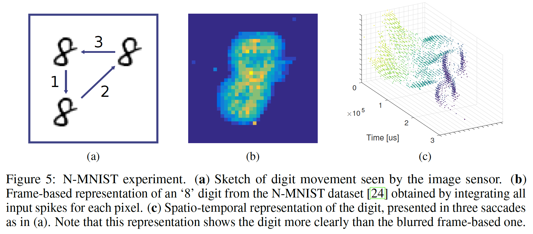 这些记录由视觉传感器vision sensor生成的事件组成,而传感器面对来自 MNIST 数据集的静态数字执行三个扫视运动saccadic movement (如下图 (a) 所示)。事件响应的例子可以在下图 (c) 中看到。