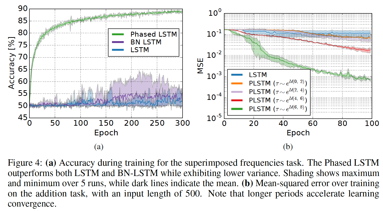尽管更具有挑战性,但是下图 (a) 展示了与使用完全相同的参数的标准方法相比,Phased LSTM 收敛到正确的解的速度有多快。此外,Phased LSTM 在训练期间似乎表现出非常低的方差。