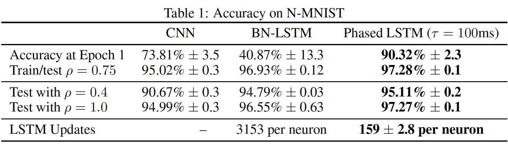 CNN 网络在 N-MNIST 数字的 frame-based representation 上进行训练。BN-LSTM 直接在 event stream 上进行训练。Phased LSTM 也直接在 event stream 上进行训练。我们没有展示常规的 LSTM,因为发现它的性能更差。