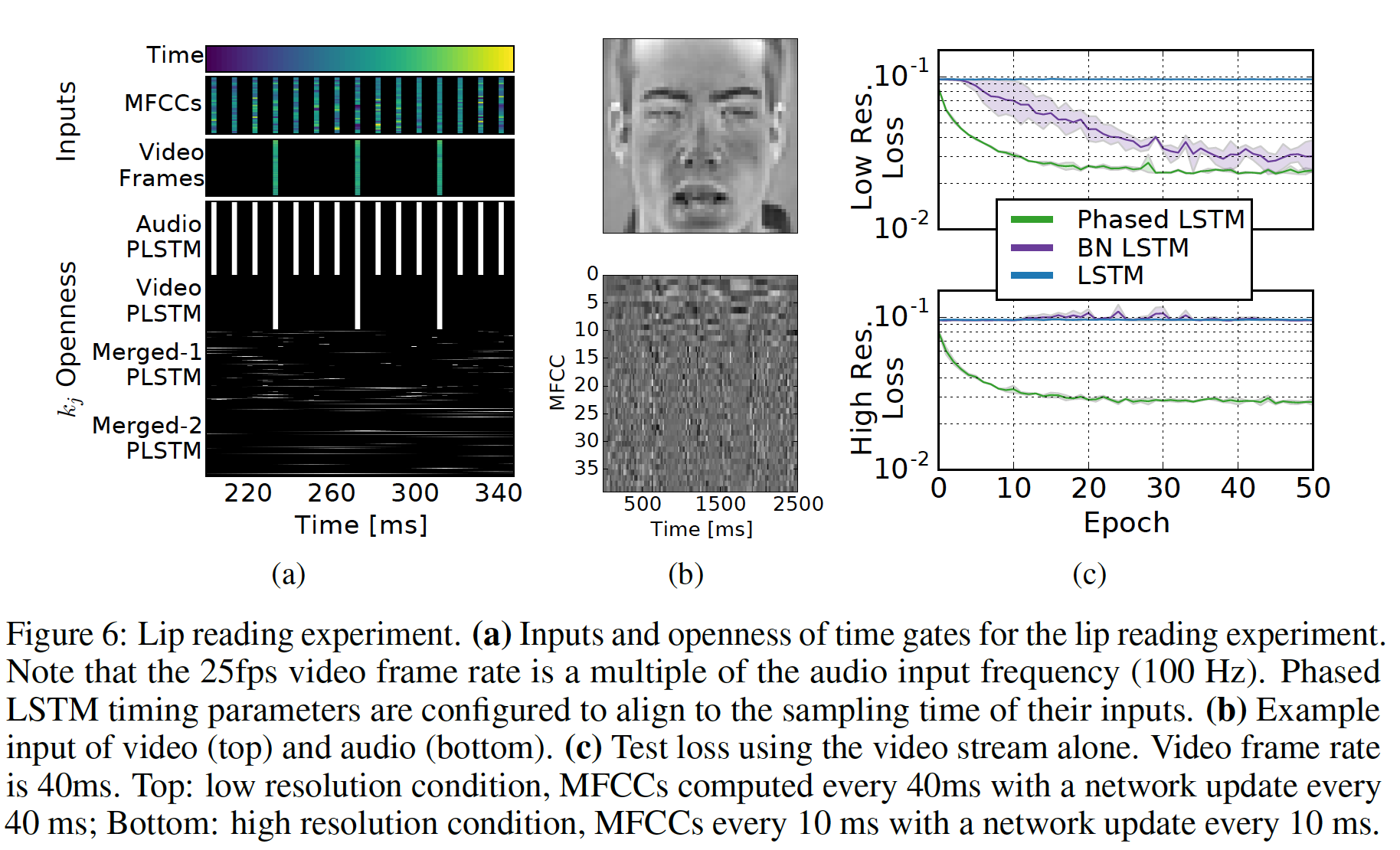 low-resolution 版本中(下图(c) 的顶部),MFCC 的采样率与 25fps 视频的采样率相匹配。high-resolution 版本中(下图 (c)的底部,以及下图 (a)),MFCC 的采样率设置为更常见的 100Hz 。较高的音频采样率并没有提高准确性,但是允许更短的延迟(10ms 而不是 40ms)。Phased LSTM 的收敛速度再次显著快于 LSTM 和 BN-LSTM 。81.15% 的峰值准确率优于 lipreading-focused 的 state-of-the-art 方法,同时避免了人工制作的特征。