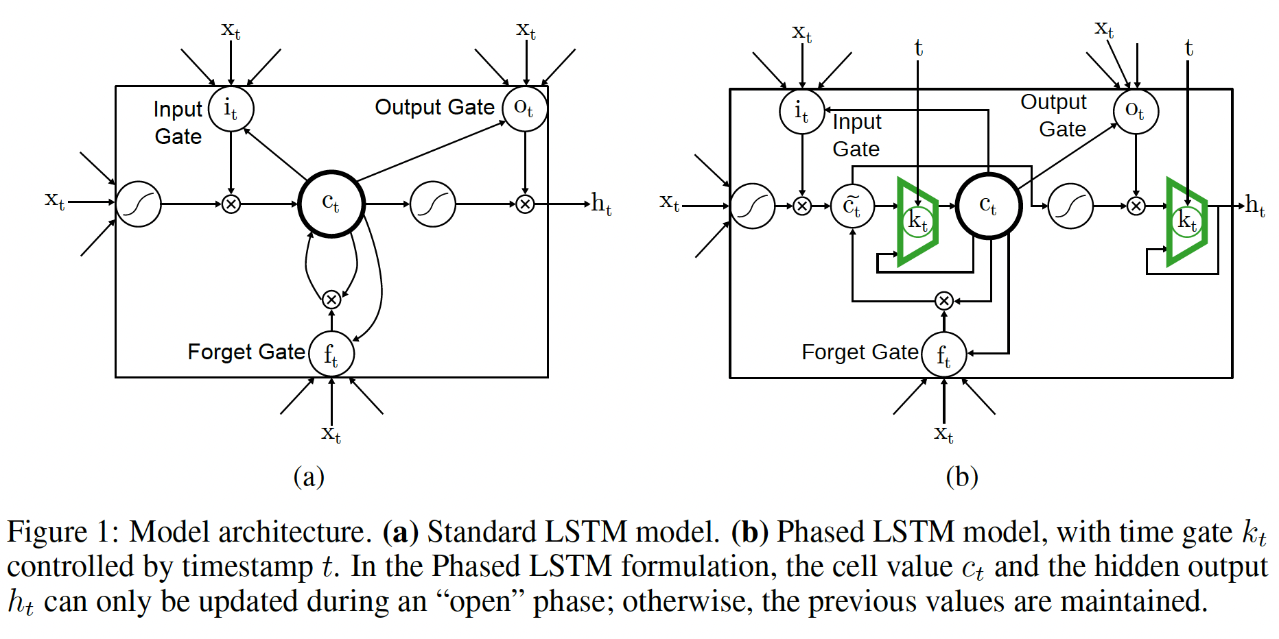 input gate,forget gate,output gate,cell activation vector ,hidden state vector ,input feature vector 。sigmoid 非线性激活函数,而 tanh 非线性激活函数。LSTM 的实现并未引入这一项)。Hadamard product 。Phased LSTM 通过增加一个新的 time gate LSTM 模型,如下图 (b) 所示。time gate 的打开和关闭是由三个参数指定的、独立的 rhythmic oscillation 所控制的,只有当 time gate 打开时才允许更新 cell state hidden state