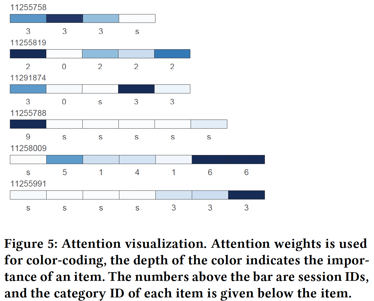 不同层的注意力不同。显然, layer 2 的注意力往往集中在更近 more recent 的 item 上。这是因为 layer 2 直接连接到输出层,而 recent item 在预测未来方面起着更重要的作用。