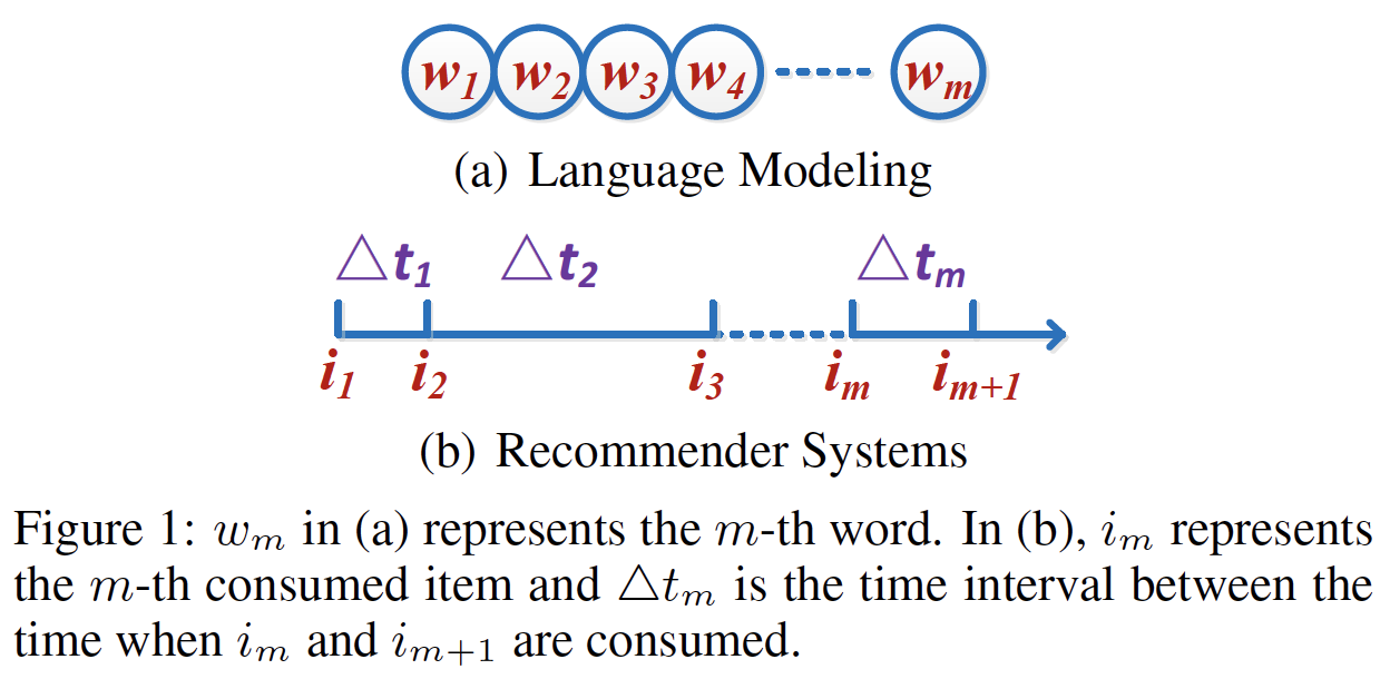 然而,推荐系统中的上述 RNN 解决方案都没有考虑用户相邻动作action 之间的时间间隔 time interval ,而这些时间间隔对于捕获用户动作之间的关系很重要。例如,间隔时间很短的两个动作往往是相关的,而间隔时间很长的两个动作往往是针对不同的目标。因此,在建模用户行为时,利用时间信息来提高推荐性能非常重要。我们使用下图来展示时间间隔是什么、以及它如何使得推荐系统与语言模型等传统领域不同。具体而言,在语言模型中没有相邻词之间的间隔的概念(如 RNN 架构擅长对下图 (a) 中的序列数据sequential data的顺序信息order information进行建模,但是无法很好地对下图 (b) 中的时间间隔进行建模。因此,需要提出新的模型来解决这个问题。