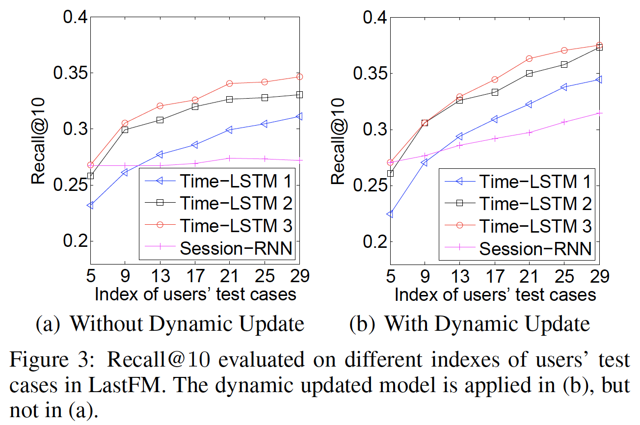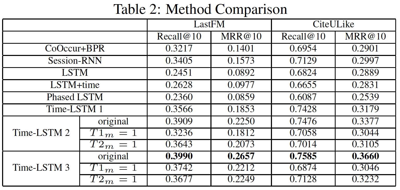 所提出的模型 Time-LSTM 为 LSTM 配备了精心设计的 time gate,因此它不仅擅长建模序列数据中的顺序信息,还可以很好地捕获对象之间的时间间隔。这是一个一般general的思想(不限于推荐系统),可以开发 Time-LSTM 的其它变体来建模其它任务中 event-based 的序列数据。