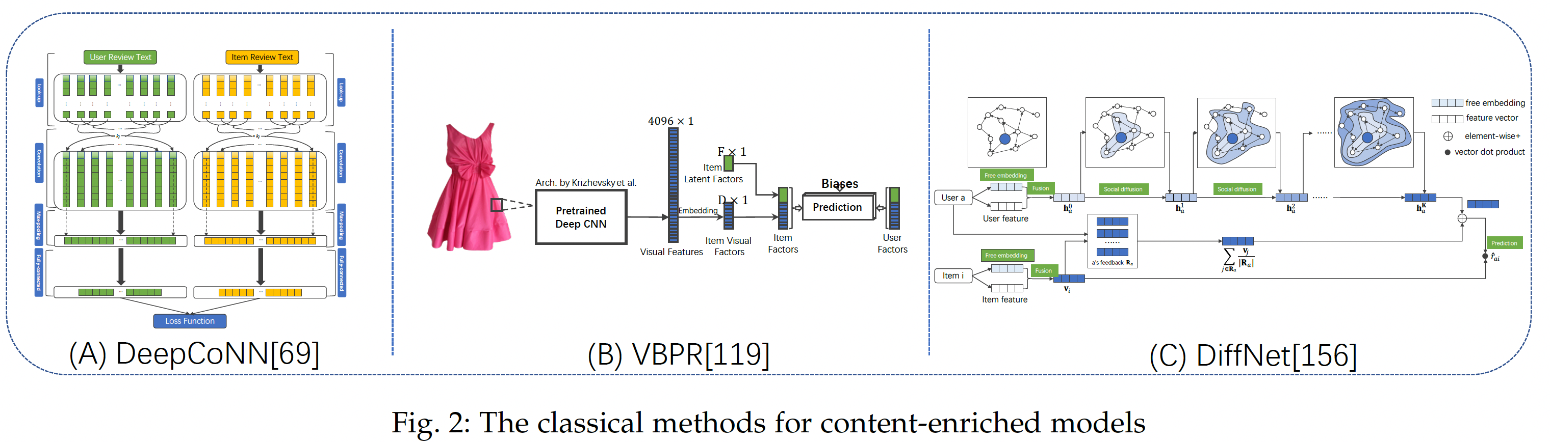 item 或用户相关联的内容描述,例如文章的摘要、用户的内容描述。user-item pair,例如用户将 tag 添加到 item 上、或用户对 item 撰写评论。对于第二类,大多数模型聚合了与每个用户或每个 item 相关的内容。此时,第二类内容信息退化为第一类。