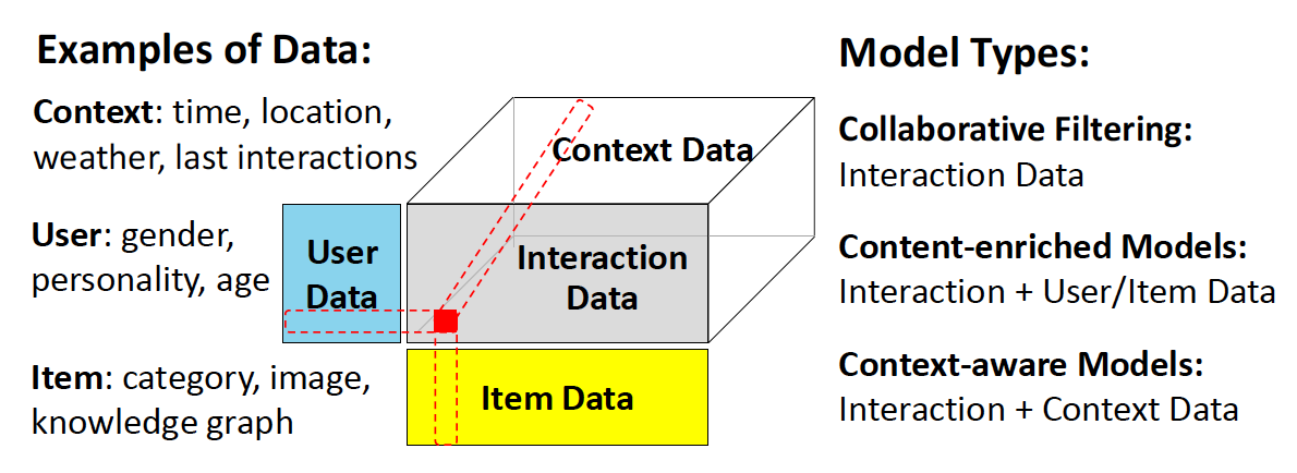 collaborative filtering: CF 模型。协同过滤模型构成了个性化推荐的基础,是推荐领域中研究最多的主题。协同过滤模型可以被视为忽略上下文数据 id 或者交互历史。item 的辅助信息集成到推荐中的模型,例如用户的画像和社交网络、item 的属性和知识图谱。我们将它们称作 content-enriched 模型,它们通过集成辅助信息到 user-item 交互相关联,但是不属于用户内容或 item 内容,如时间time、位置 location、历史交互序列。除了用户相关数据 item 相关数据 context-aware 模型还基于上下文数据 下图说明了用于推荐建模的典型数据和三种模型类型。值得注意的是,不同的模型是针对不同的推荐场景而设计的。尽管如此,在很多情况下,我们可以对模型的组件进行简单的调整,使其适合(至少在技术上可行)另一种场景。例如:
