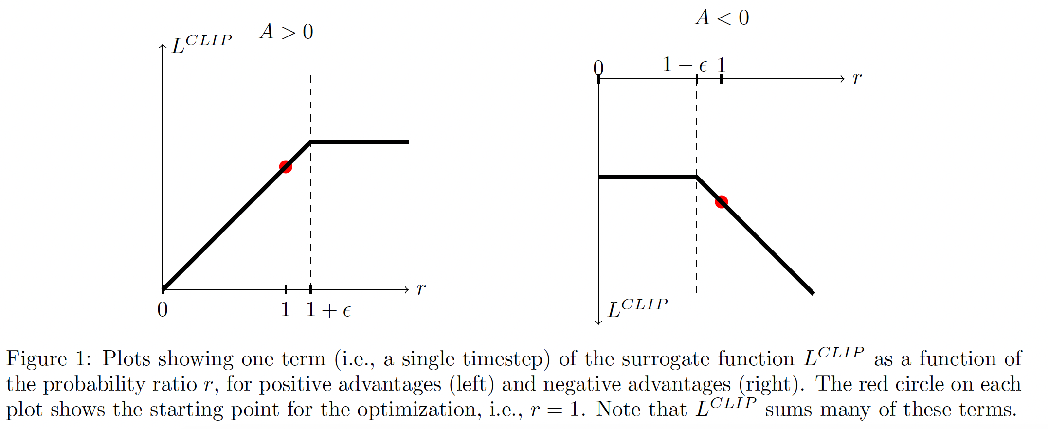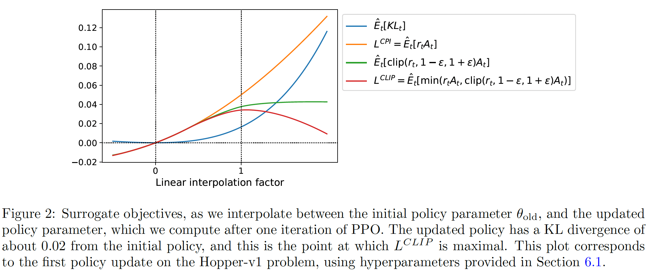 这个目标函数的动机如下。min 函数内的第一个项是 probability ratio 从而修改 surrogate objective , clipped objective 和 unclipped objective 的最小值,所以最终的目标函数是 unclipped objective 的下限(即,悲观的下界)。