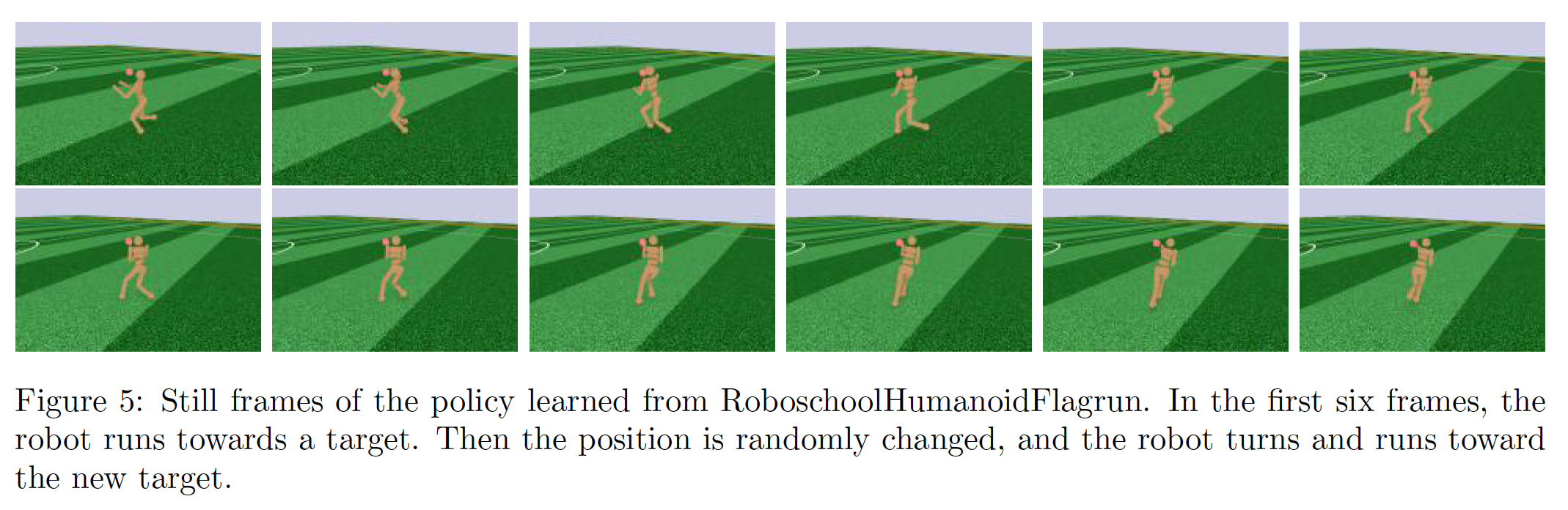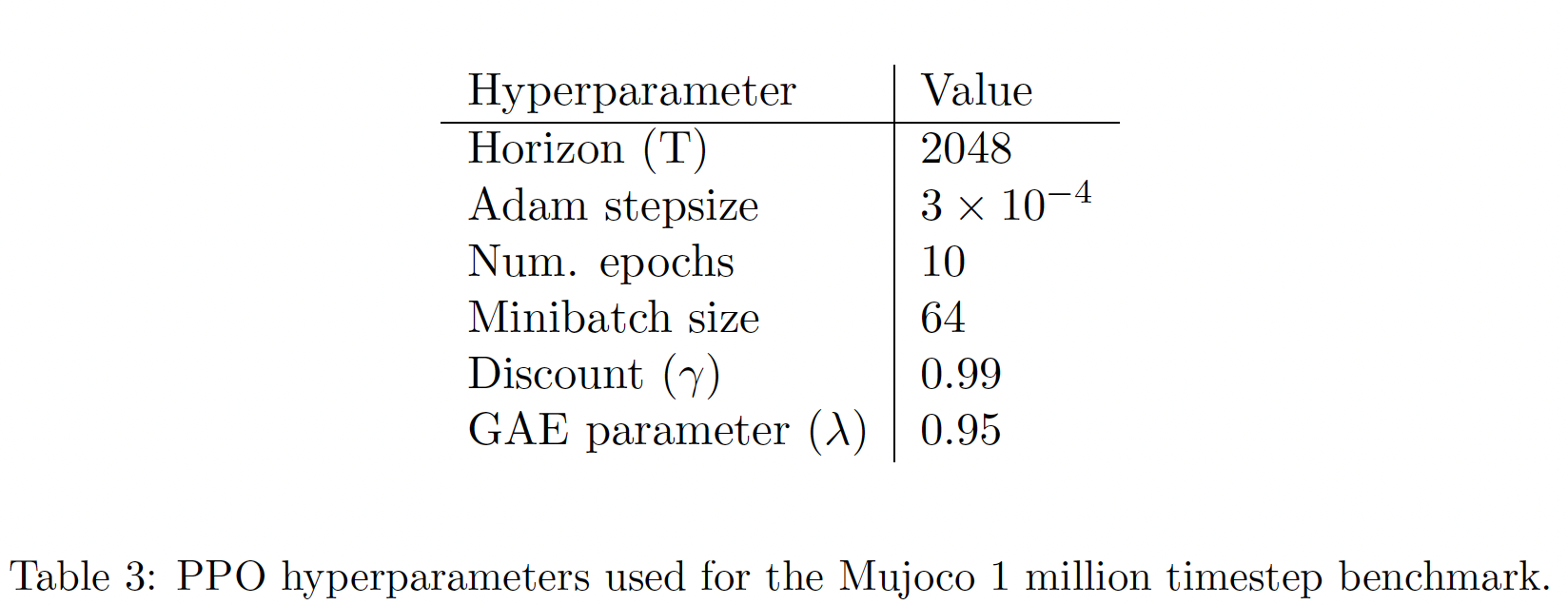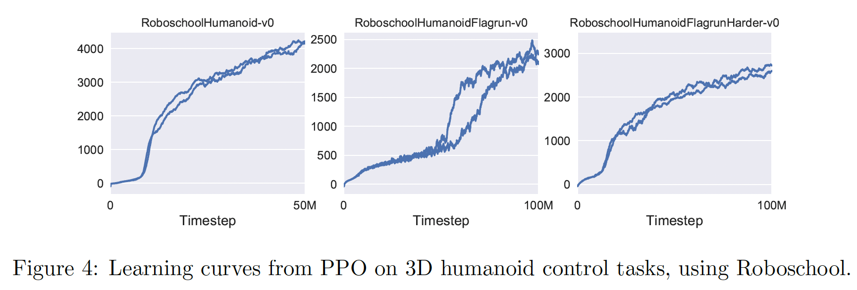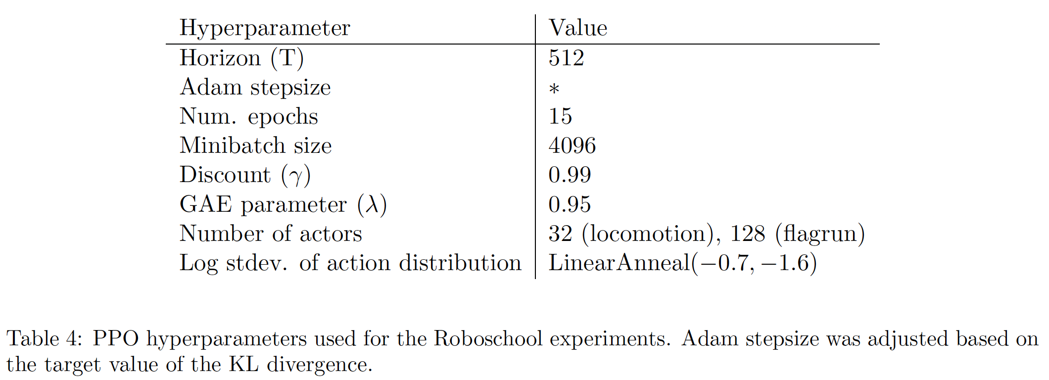 RoboschoolHumanoid :仅向前运动。RoboschoolHumanoidFlagrun :每隔 200 个 timestep 则 position of target 随机变化,或只要达到目标则 position of target 就随机变化。RoboschoolHumanoid-FlagrunHarder:机器人被方块砸中,需要从地上站起来。Figure 5 是学习策略的静止画面,Figure 4 是这三个任务的学习曲线。下表中提供了超参数。在同期的工作中, 《Emergence of Locomotion Behaviours in Rich Environments》 使用PPO 的自适应 KL 变体来学习三维机器人的运动策略。