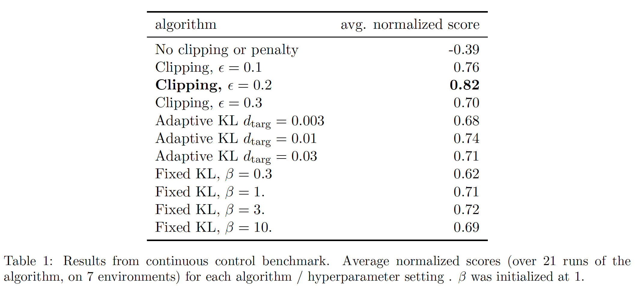 KL penalty ,可以使用一个固定的惩罚系数 target KL value log space (而不是线性空间)中进行剪裁,但发现其性能并没有提高。因为我们正在为每个算法搜索超参数,所以我们选择了一个计算量小的 benchmark 来测试算法。也就是说,我们使用了在OpenAI Gym 中实现的 7 个模拟机器人任务,它们使用了 MuJoCo 物理引擎。我们在每个任务上做 1M timesteps 的训练。除了用于裁剪的超参数( KL penalty(