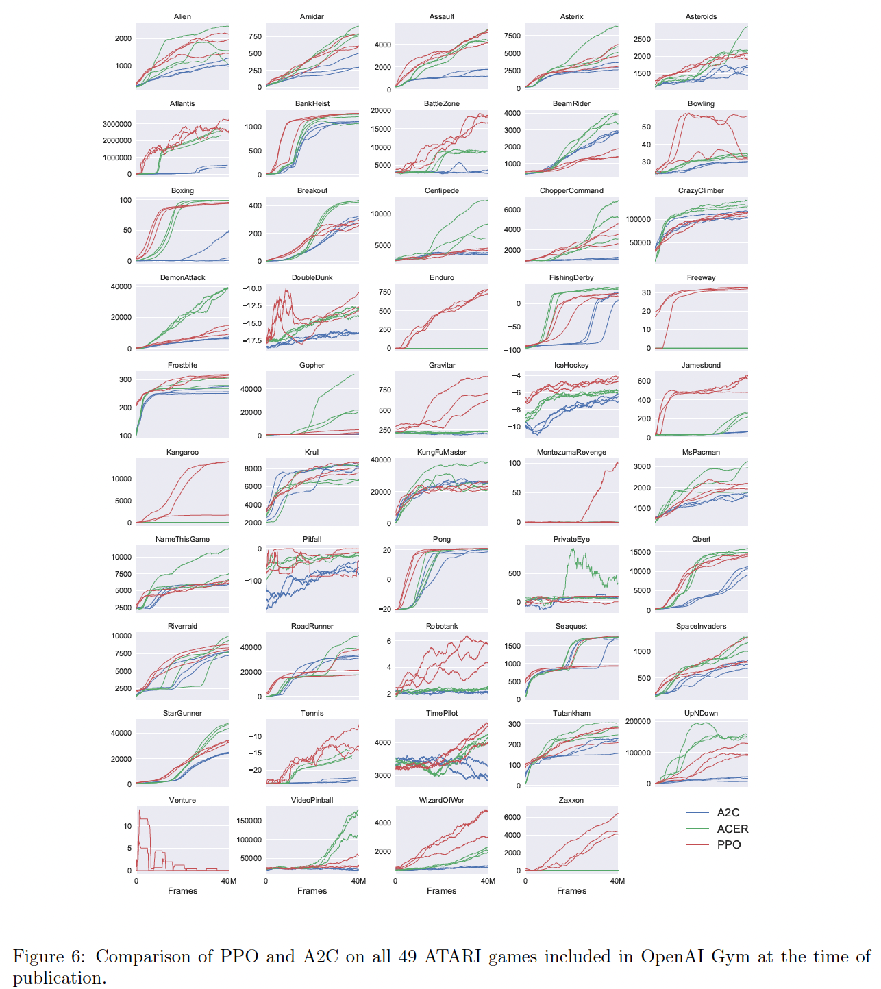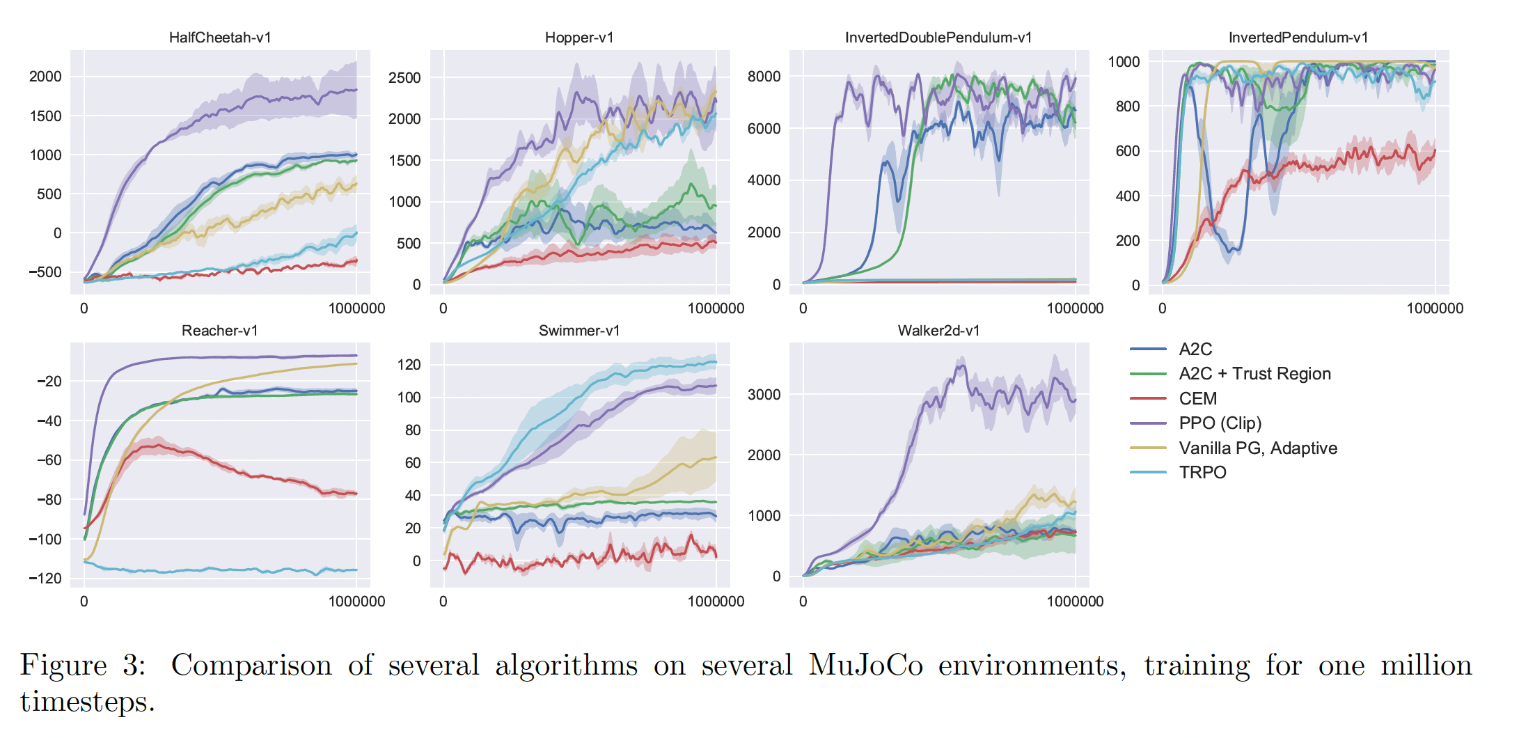 trust region policy optimization (《Trust region policy optimization》)。cross-entropy method: CEM(《Learning Tetris using the noisy cross-entropy method》)。A2C (《Asynchronous methods for deep reinforcement learning》)。trust region 的 A2C (《Sample Efficient Actor-Critic with Experience Replay》)。A2C 代表 advantage actor critic ,是 A3C 的一个同步版本,我们发现它的性能与异步版本(即 A3C )相同或更好。对于PPO,我们使用了上一节中的超参数,其中 PPO 在几乎所有的 continuous control environments 上都优于以前的方法。