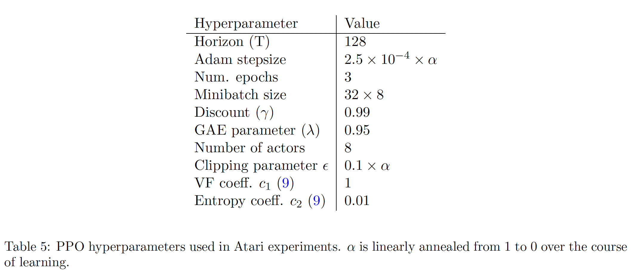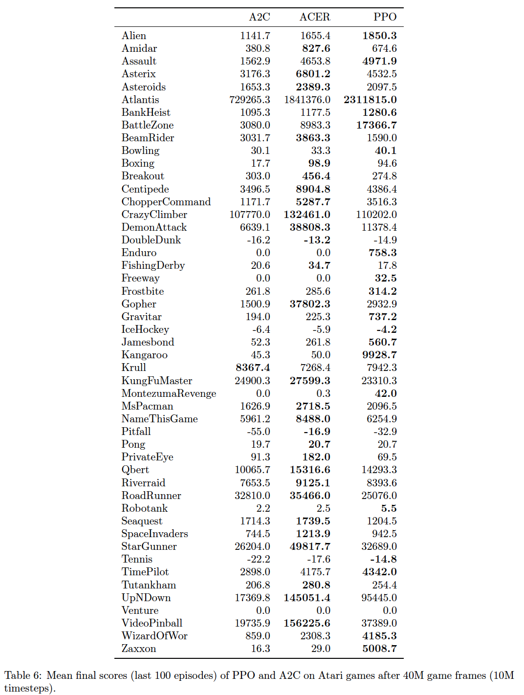 我们还在 Arcade Learning Environment 这个 benchmark 上运行 PPO ,并与 A2C (《Asynchronous methods for deep reinforcement learning》)和 ACER (《Sample Efficient Actor-Critic with Experience Replay》)的 well-tuned 实现进行比较。对于这三种算法,我们使用了与 《Asynchronous methods for deep reinforcement learning》 相同的策略网络架构。下表中提供了 PPO 的超参数。对于其他两种算法,我们使用了经过调优的超参数,从而在该 benchmark 上的性能最大化。