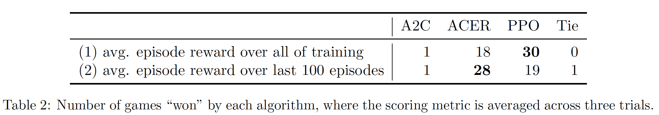 episode 的平均奖励(有利于快速学习)。100 个 episodes 的每个 episode 平均奖励(有利于最终表现)。下表显示了每种算法 "获胜" 的游戏数量,我们通过对三次试验的平均得分指标来计算胜利者。