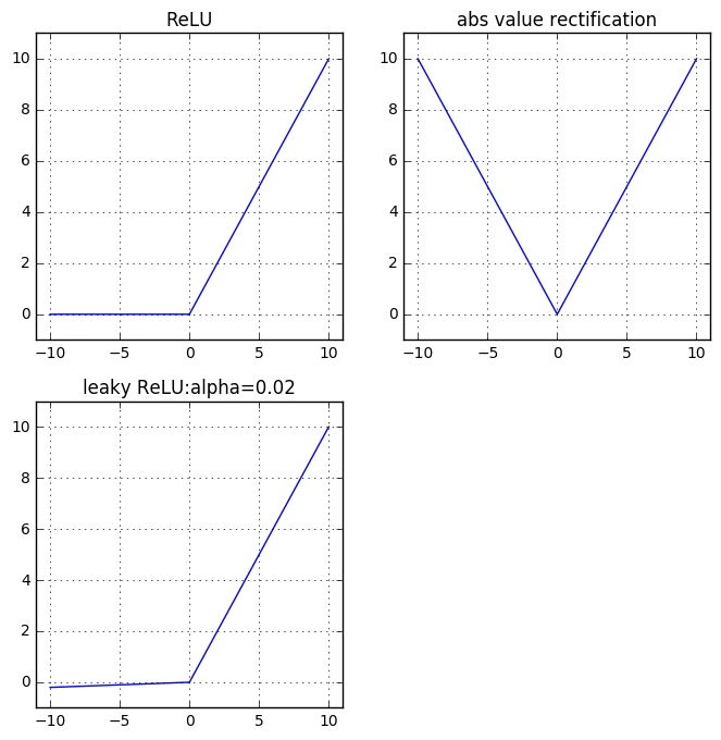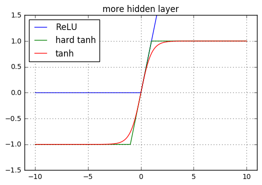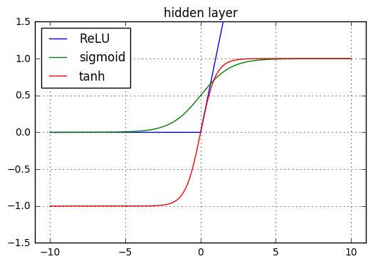 maxout单元组成的隐层可以学习实现传统激活函数的隐层相同的功能,包括:ReLU函数、绝对值修正线性激活函数、leakly ReLU函数、参数化ReLU函数,也可以学习不同于这些函数的其他函数。maxout层的参数化与ReLU层等等这些层不同(最典型的,maxout层的输出向量的维数发生变化),因此即使maxout层实现了ReLU函数,其学习机制也不同。sigmoid单元和tanh单元:其激活函数分别为sigmoid函数和tanh函数。