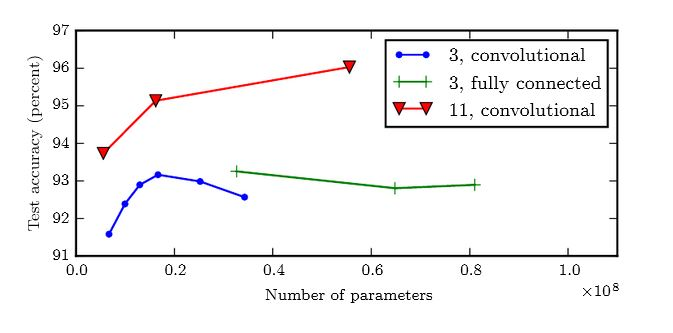下图依次表示:不同网络层数的网络的泛化性能(测试集的准确率)、不同参数数量和网络层数的网络的泛化性能。