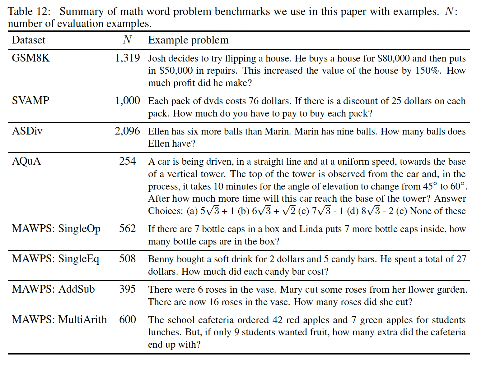 算术推理:MultiArith, GSM8K, AddSub, AQUA-RAT, SingleEq, SVAMP 。