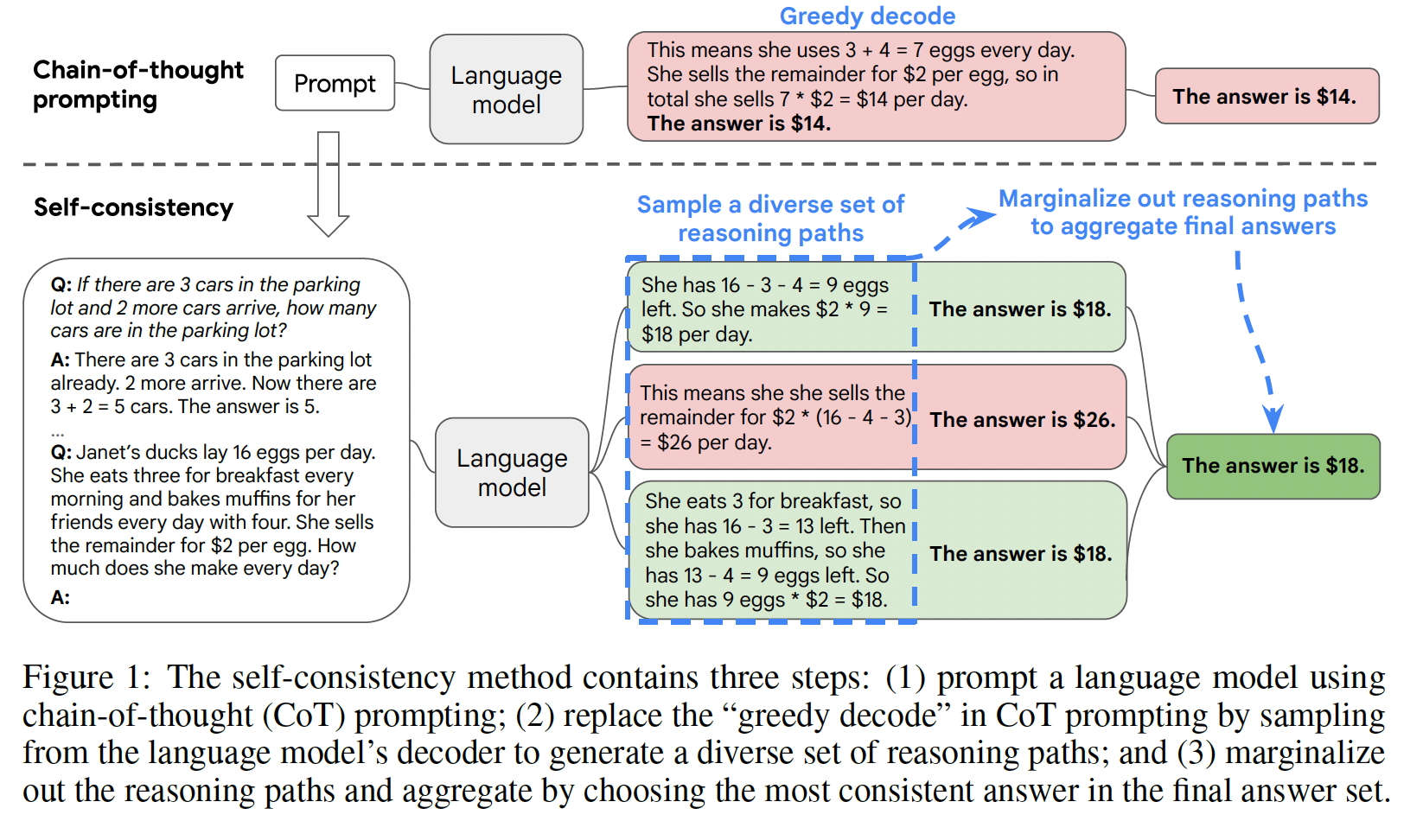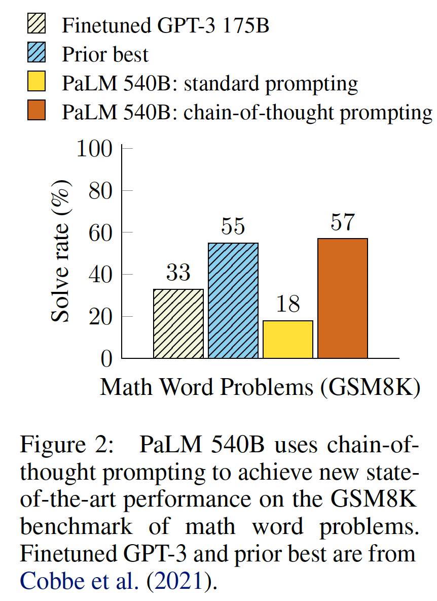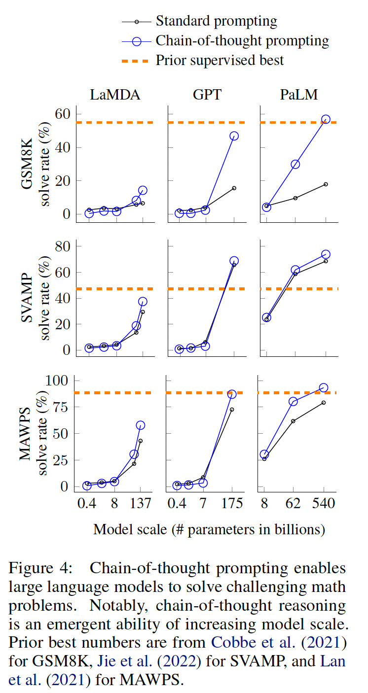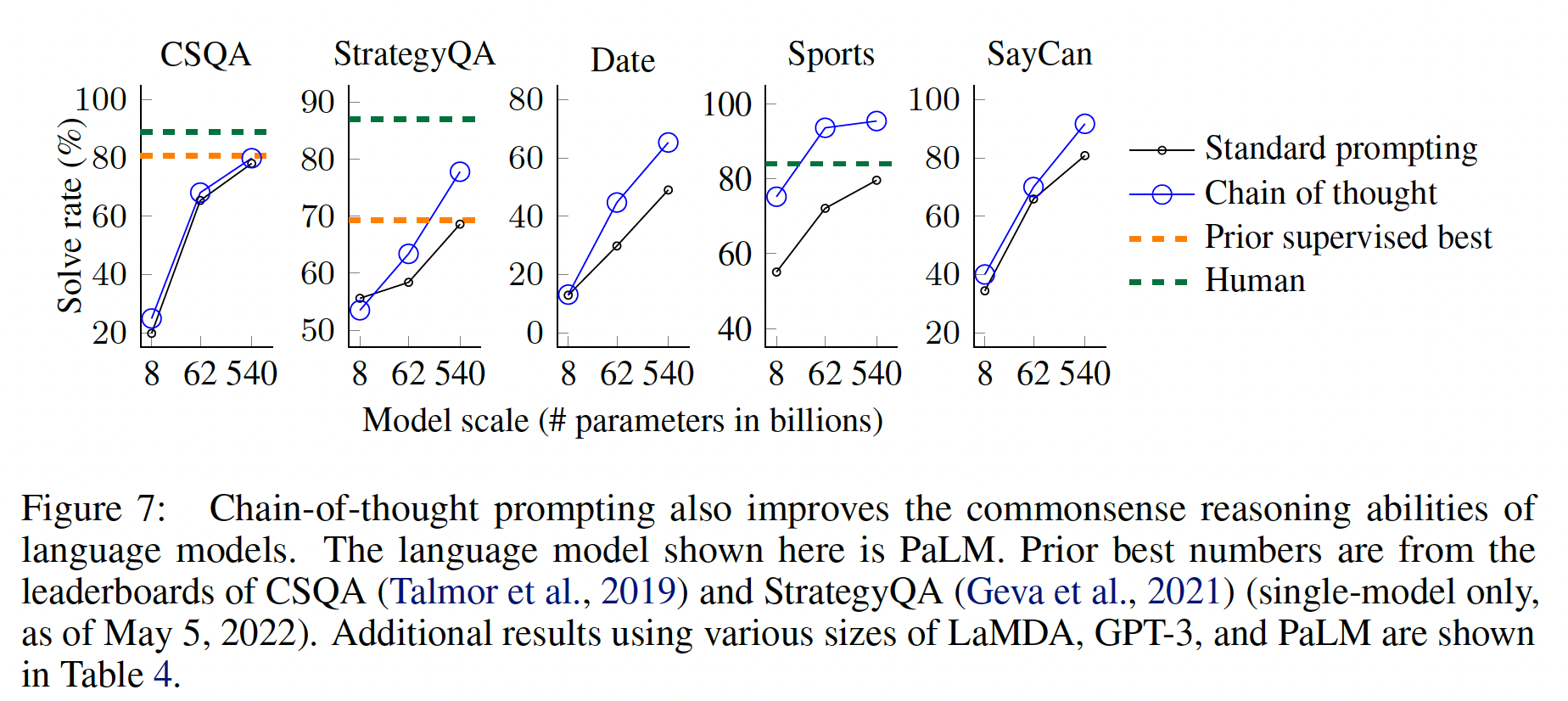 最近提出的 chain-of-thought prompting 方法(《Chain of thought prompting elicits reasoning in large language models》)为缩小人类智能和机器智能之间的差距迈出了重要一步。它结合了自然语言理由(natural language rationale)和 few-shot prompting(GPT-3)的思想。当与 self-consistency 解码(《Self-consistency improves chain of thought reasoning in language mod》)进一步整合,而不是使用典型的贪婪解码时,在许多具有挑战性的自然语言处理任务上, few-shot chain-of-thought prompting 在很大程度上超过了文献中的 SOTA 结果,这些 SOTA 结果是由专门设计的神经模型在数百倍的标注样本的训练下得到的,同时 few-shot chain-of-thought prompting 也是完全可解释的。