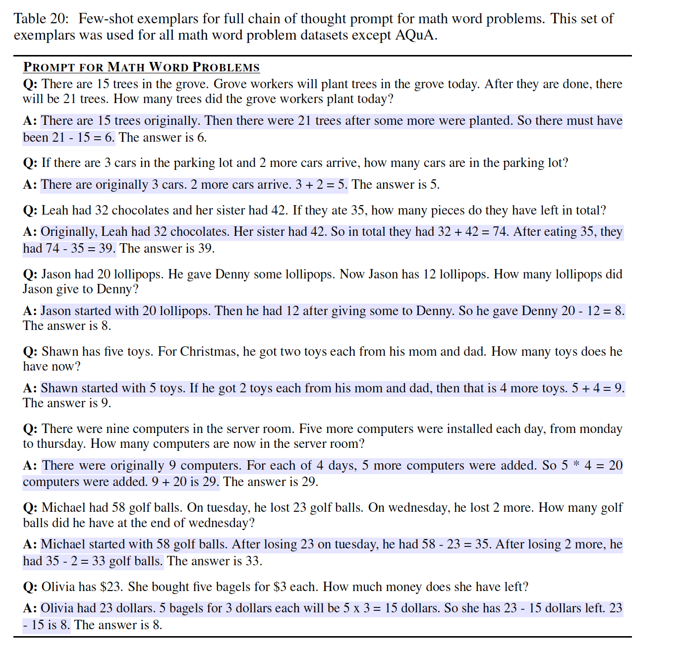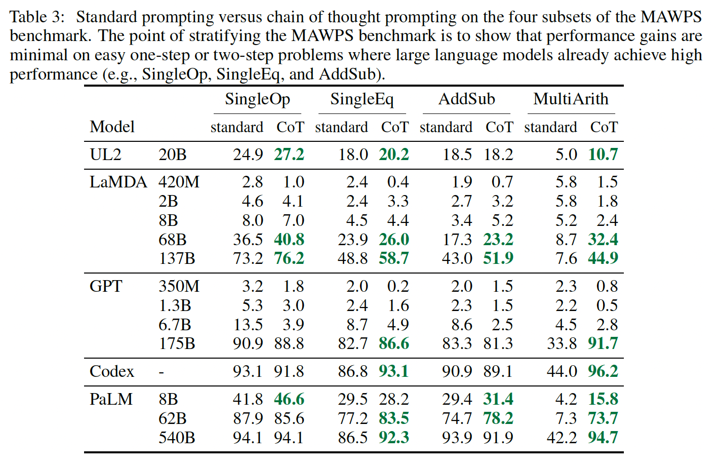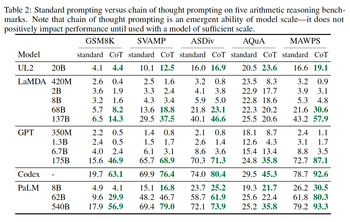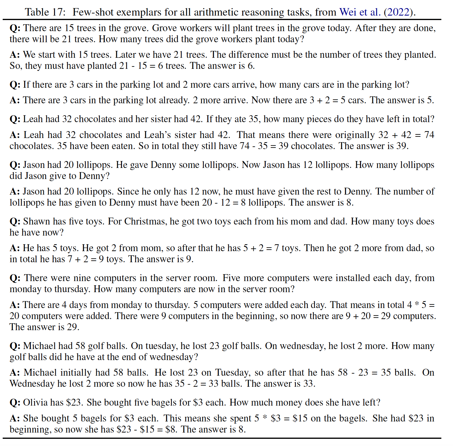 Few-Shot 和 Manual-CoT 的结果取自《Chain of thought prompting elicits reasoning in large language models》 。