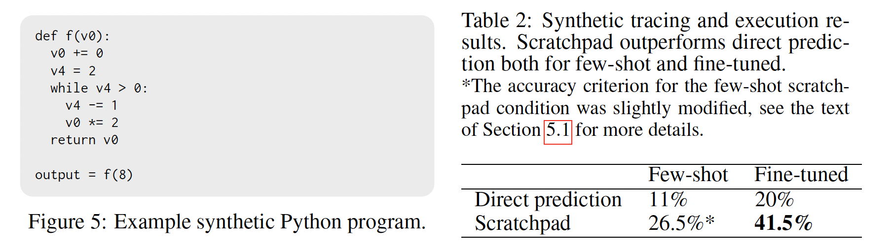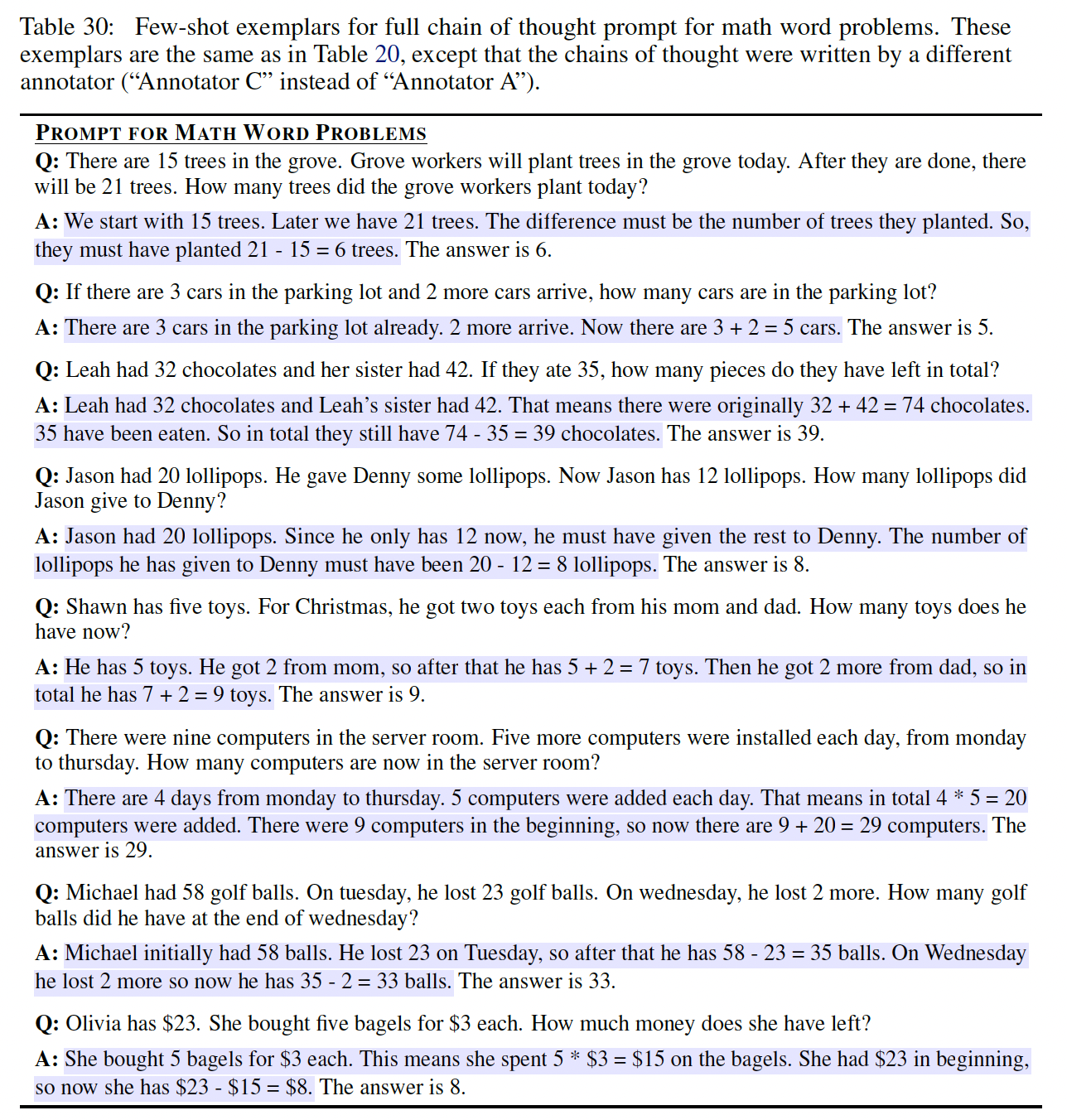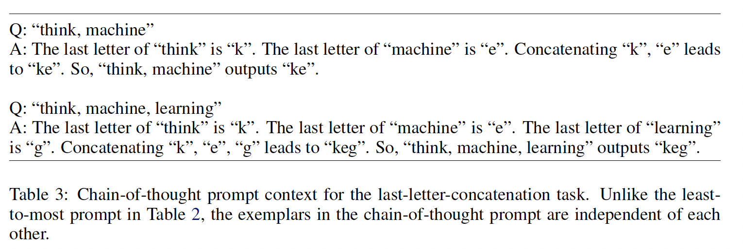 Chain-of-thought prompting:chain-of-thought prompt 如下表所示。它使用的列表与 Table 2 中的 least-to-most prompt 相同。唯一区别是:对第二个列表("think, machine, learning" )的回答是从头开始建立的,而不是使用第一个列表("think, machine" )的输出。
