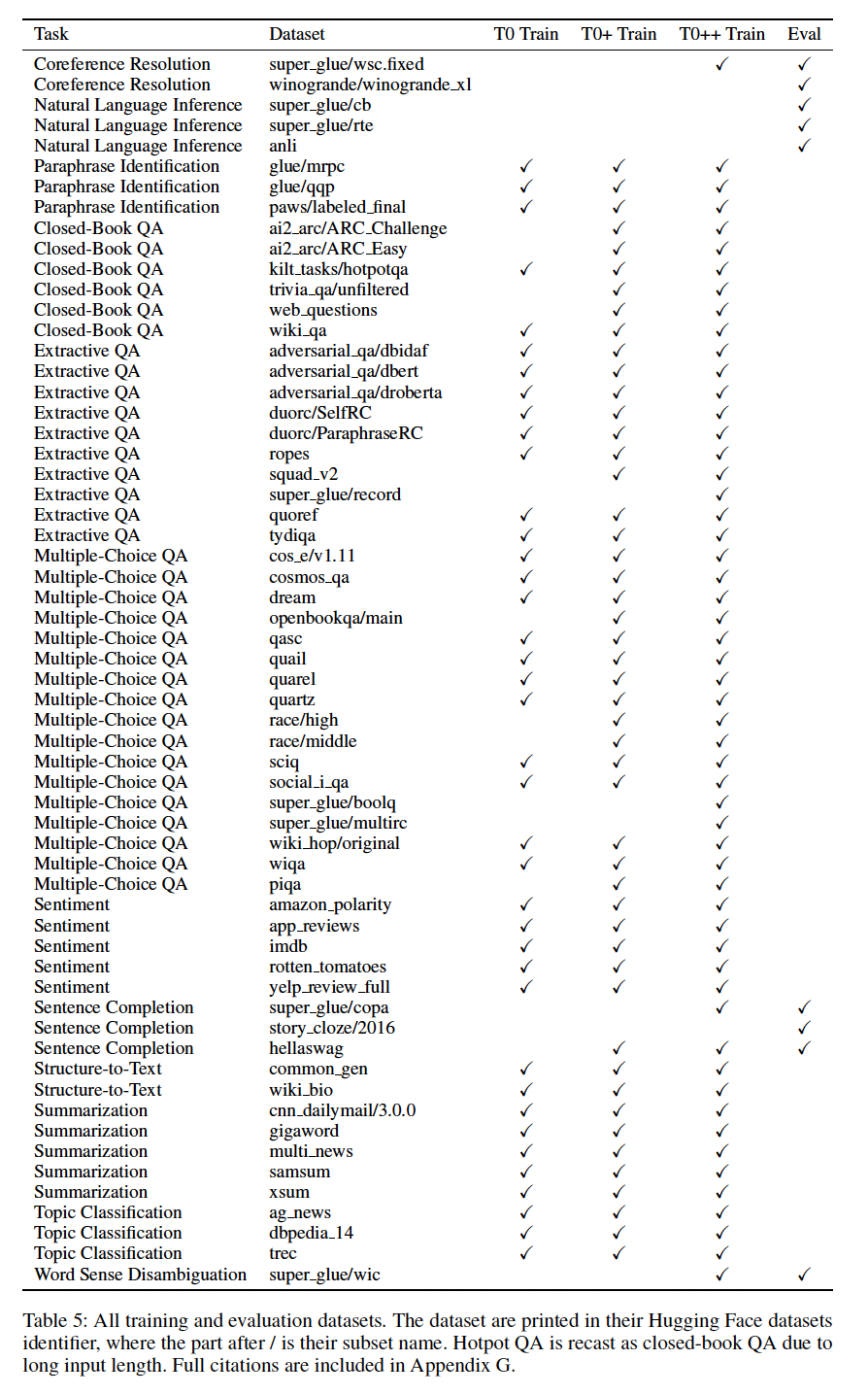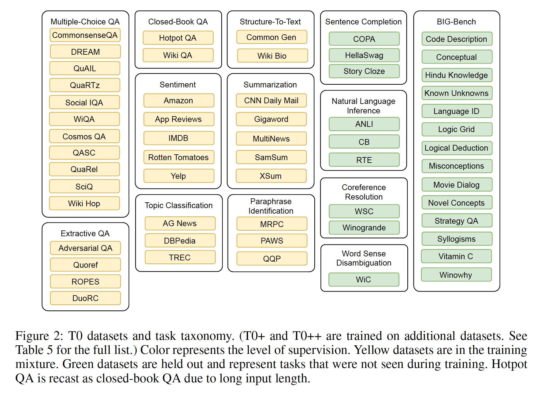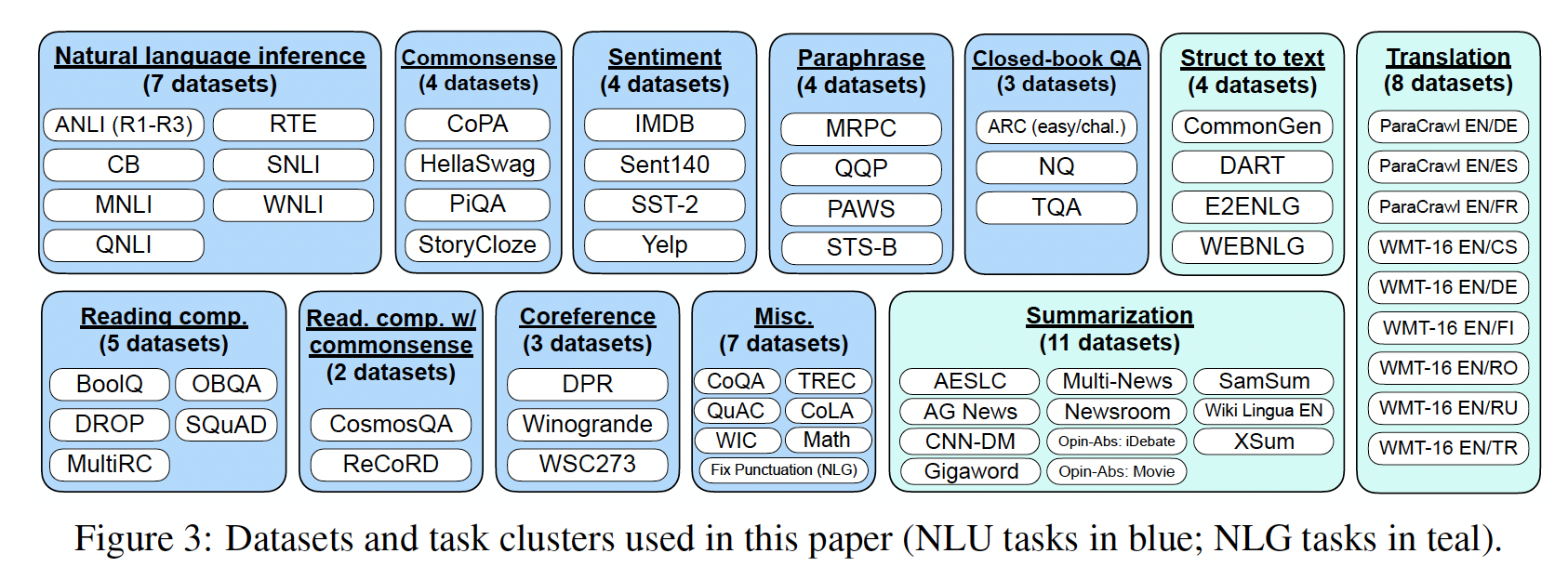 为了测试 zero-shot generalization ,我们保留了四个任务的所有组成数据集:自然语言推理(natural language inference: NLI) 、共指解析(coreference resolution)、句子补全(sentence completion )、词义消岐(word sense disambiguation )。