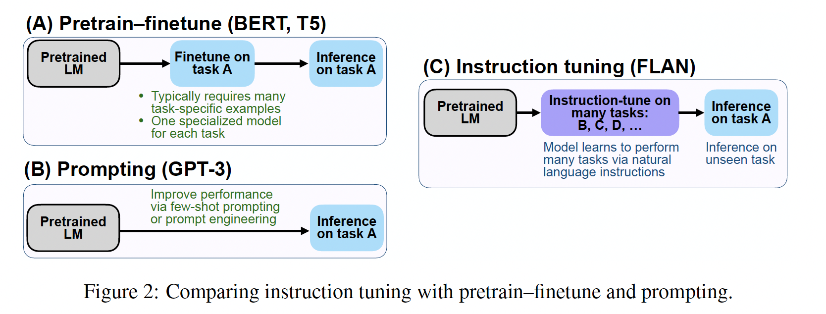 指令微调的动机是提高语言模型对 NLP 指令的响应能力。其思想是通过使用 supervision 来教导语言模型执行通过指令来描述的任务,使语言模型学会遵循指令,即使是对于 unseen 任务也能做到如此。为了评估在 unseen 任务上的性能,我们将数据集按任务类型分成 clusters ,并保留每个 task cluster 进行评估,同时在其余所有 clusters 上进行指令微调。