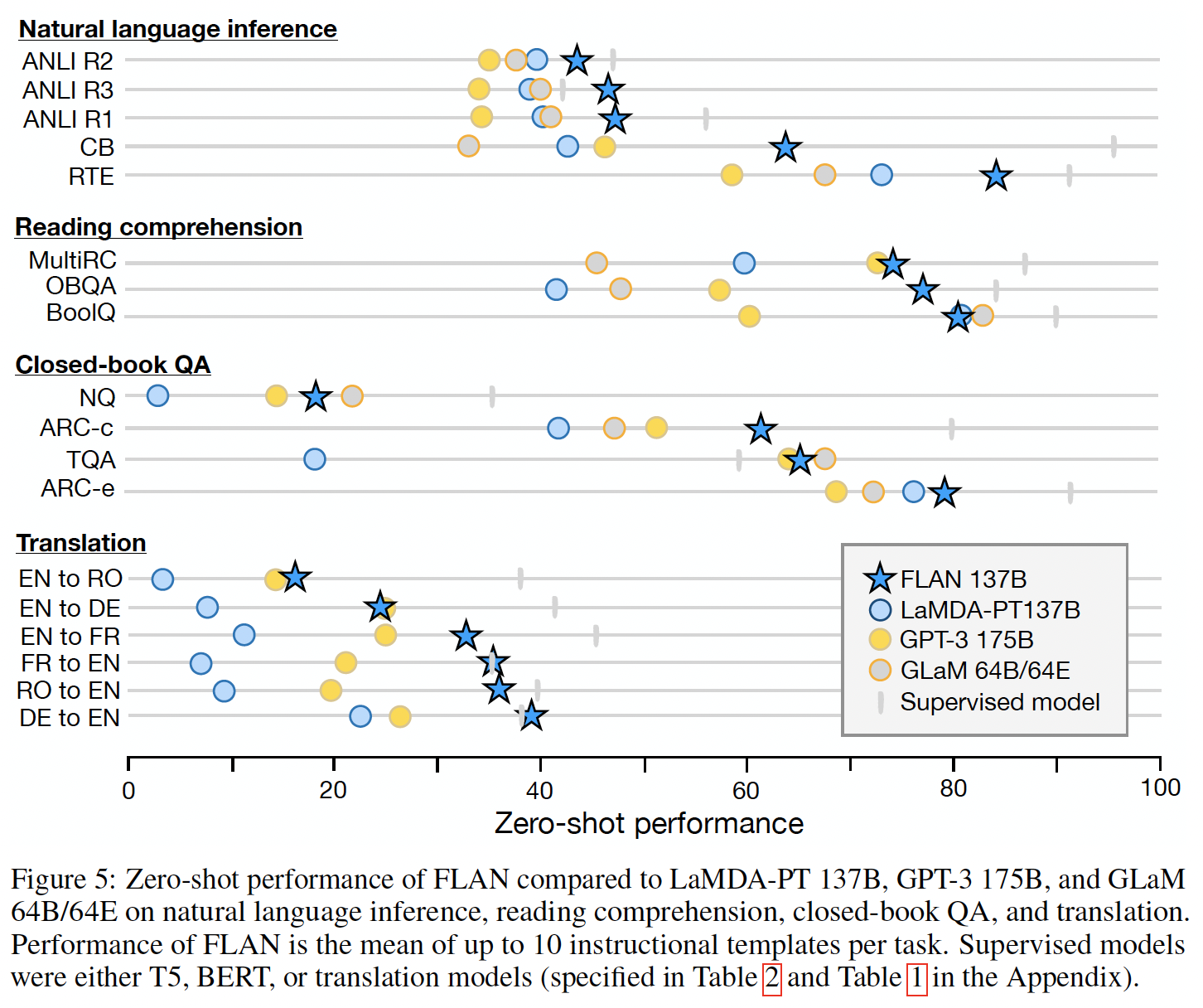 根据验证集上的最佳模板,zero-shot FLAN 在 25 个数据集中有 20 个超过了 zero-shot GPT-3 ,甚至在 10 个数据集上超过了GPT-3 的 few-shot 性能。